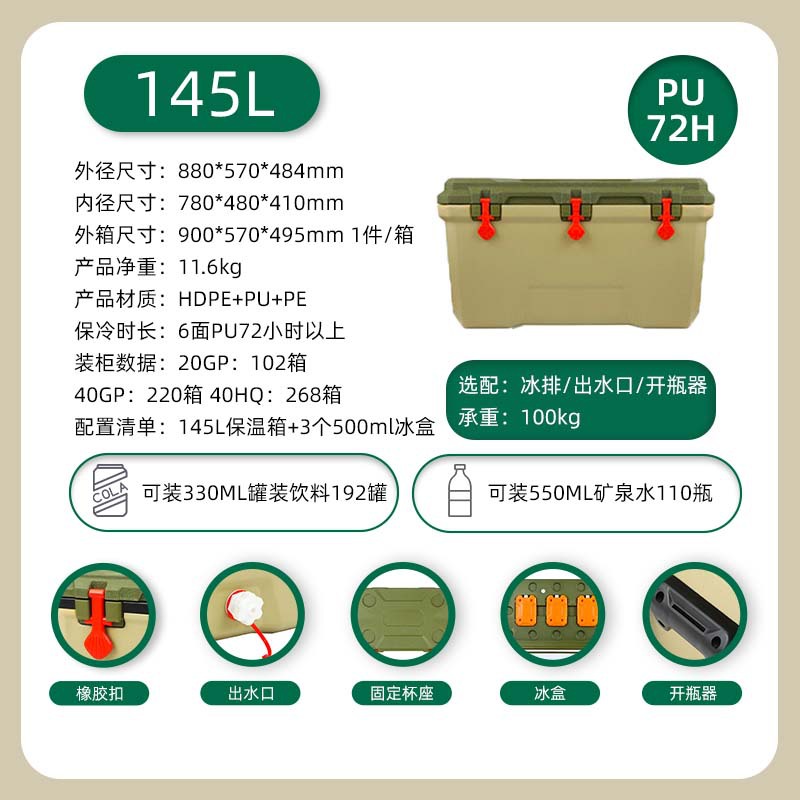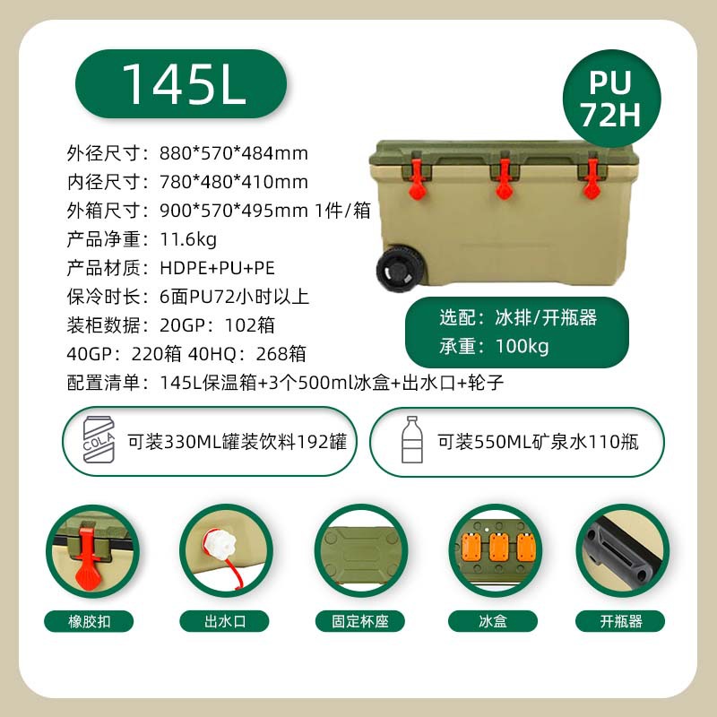 [cross-border hot selling] 145l green-wheeled model [high-equipped full six-sided pu] cold preservation for 72 hours [including 500ml ice box