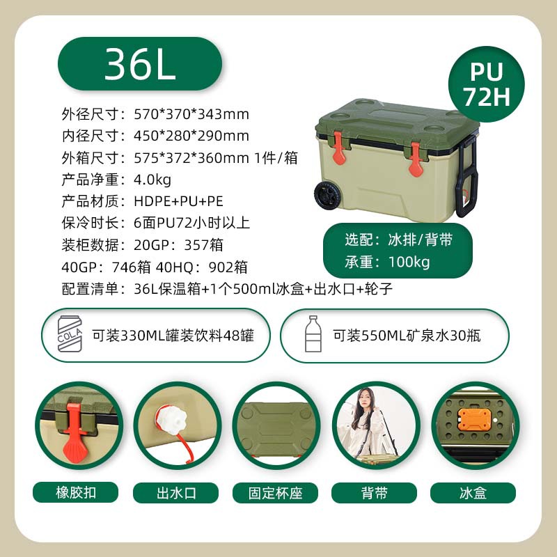 [cross-border hot selling] 36l green-wheeled model [high-equipped full six-sided pu] cold preservation for 72 hours [including 500ml ice box 1