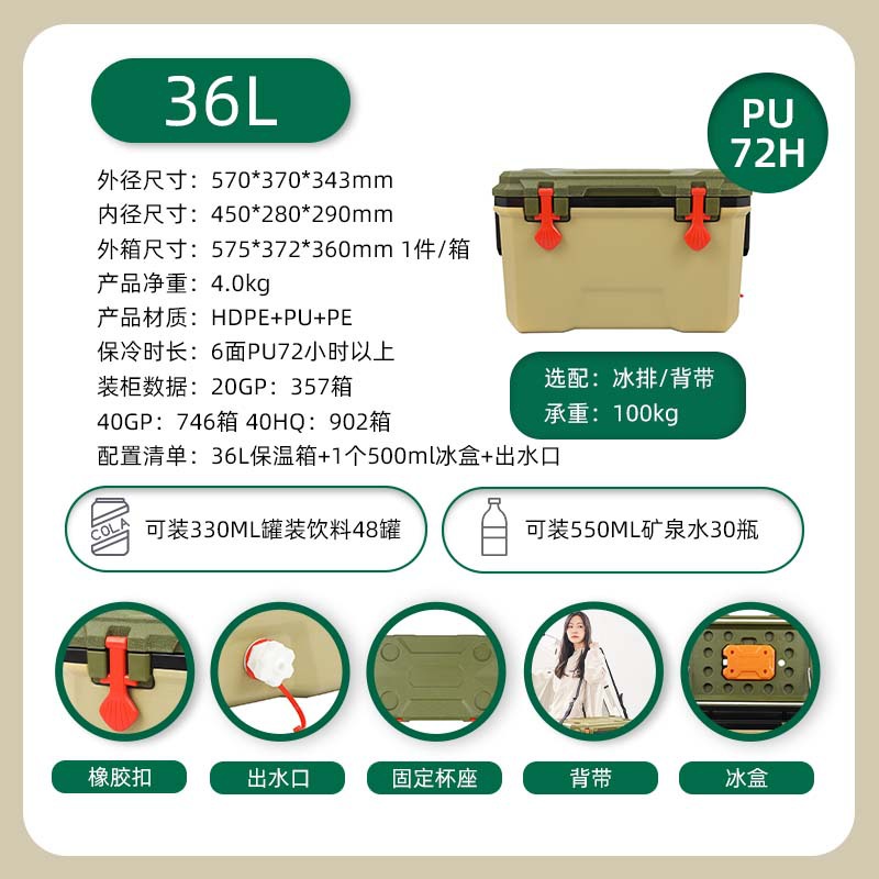 [cross-border hot selling] 36l green-handle type [high-equipped full six-sided pu] cold preservation for 72 hours [including 500ml ice box 1