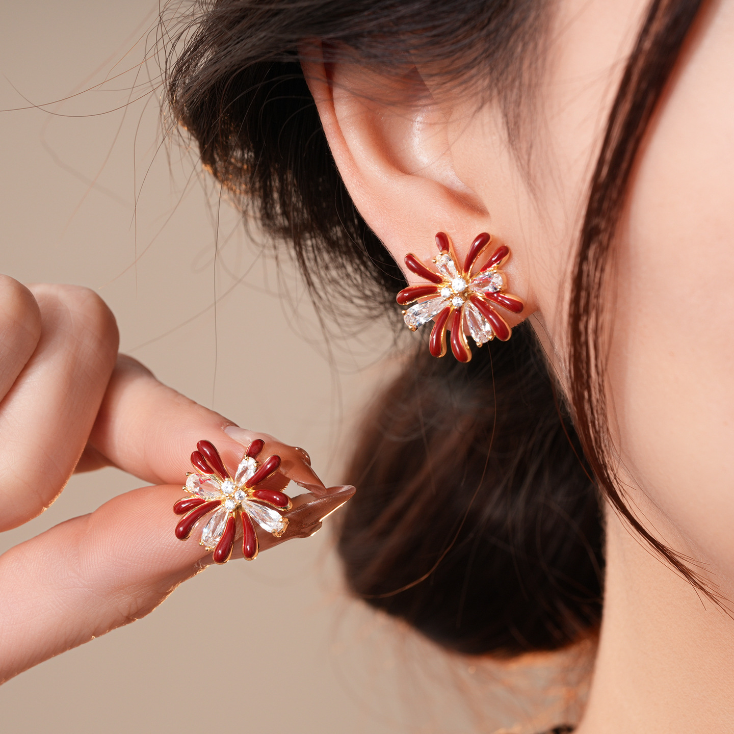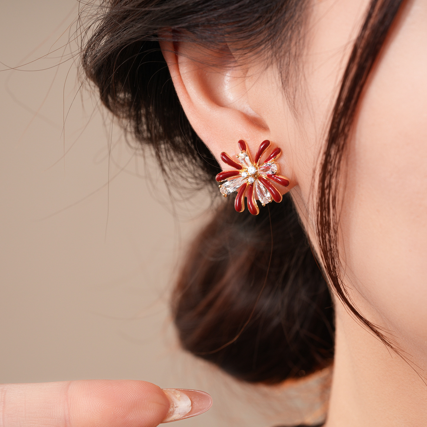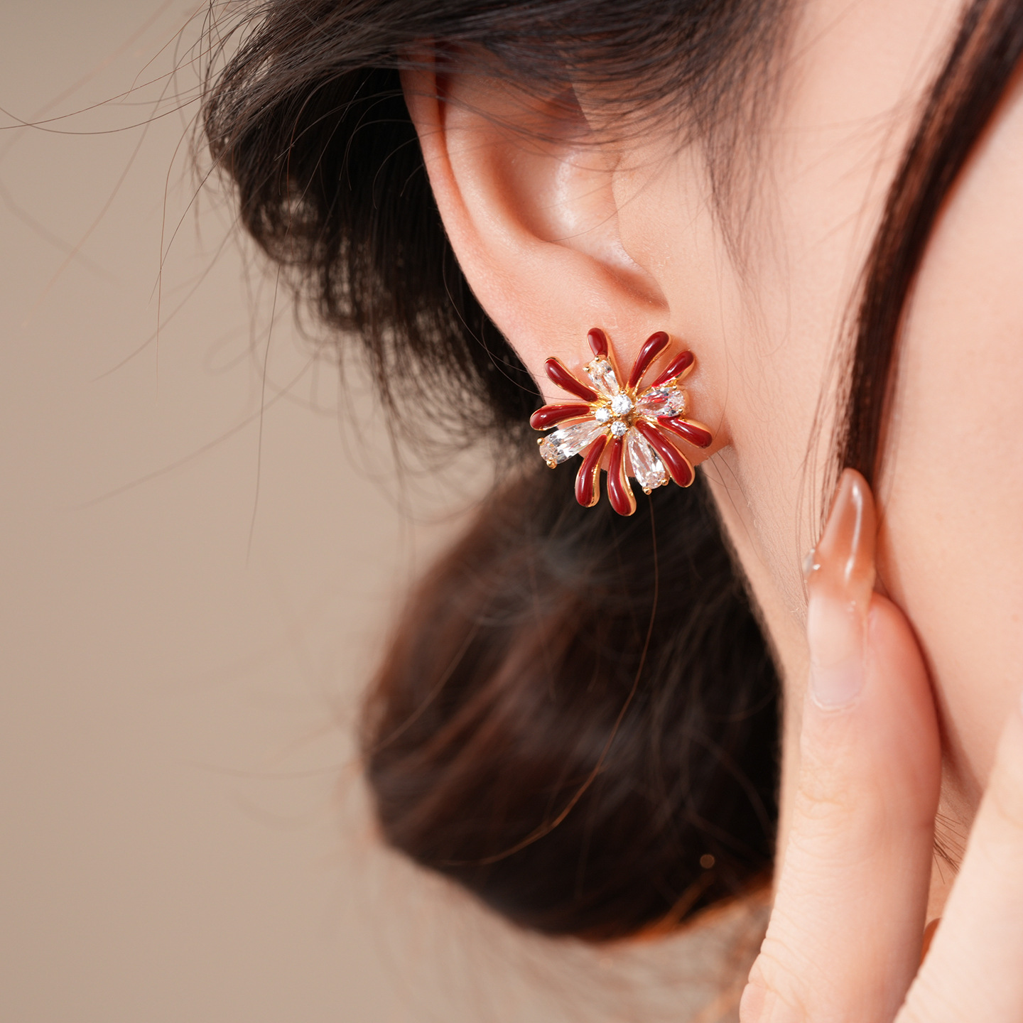 18k gold electroplated silver needle zircon red drop oil fireworks earrings light luxury high-grade earrings retro style earrings