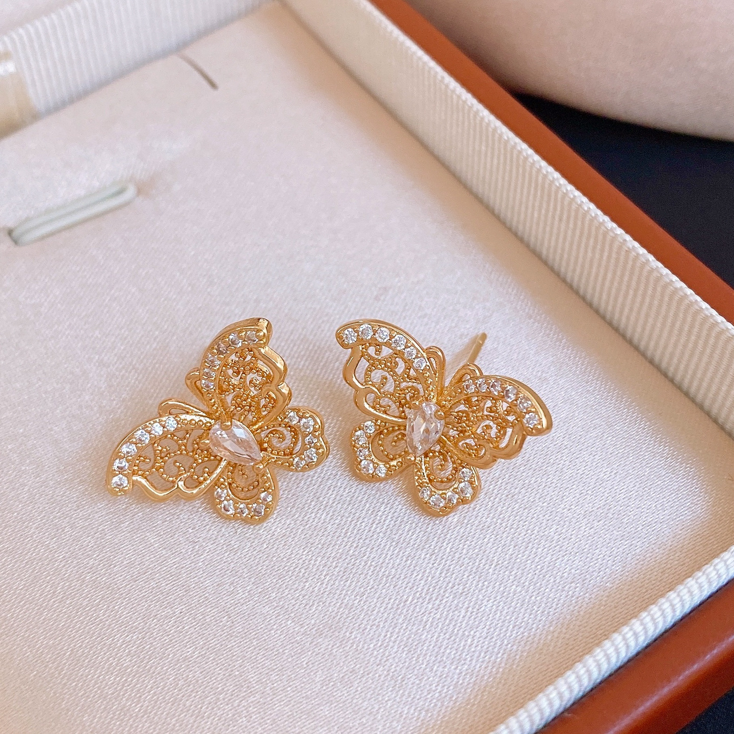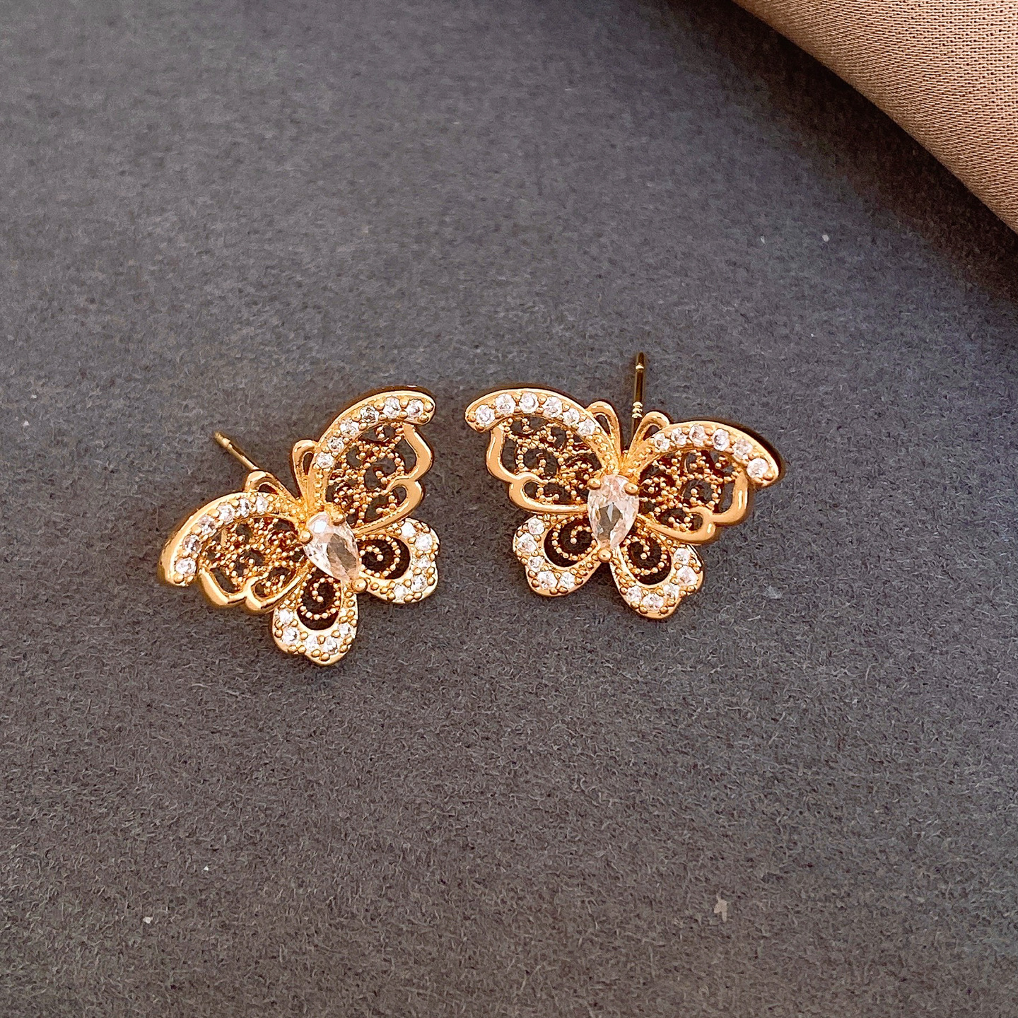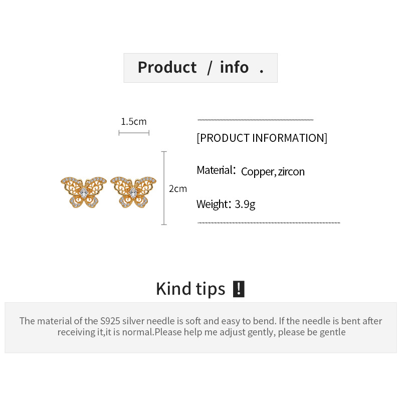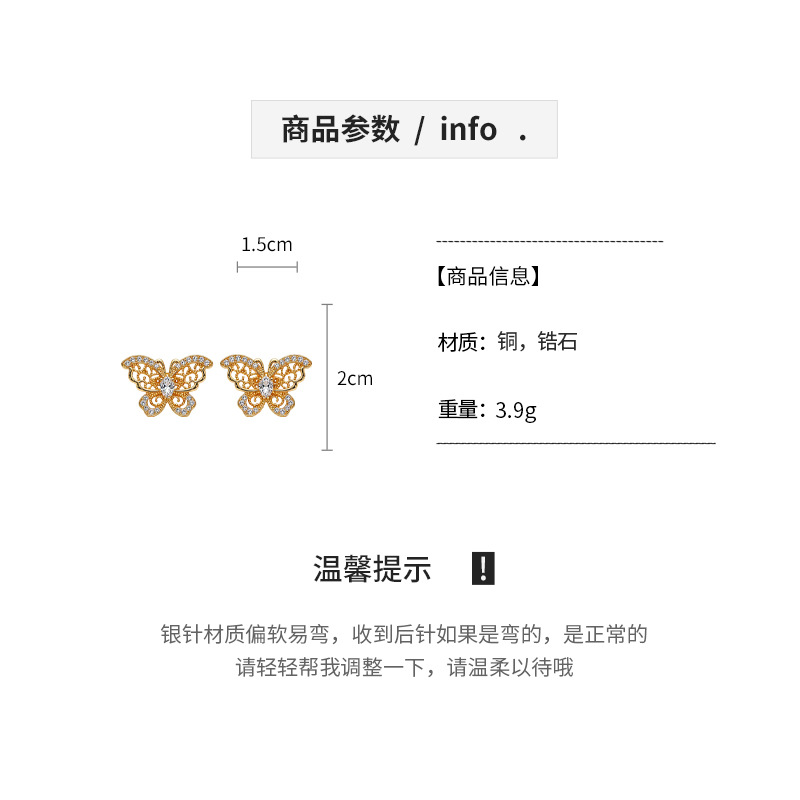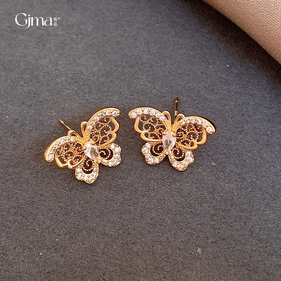18k gold electroplated silver needle zircon butterfly studs light luxury high-grade earrings french retro fashion earrings for women