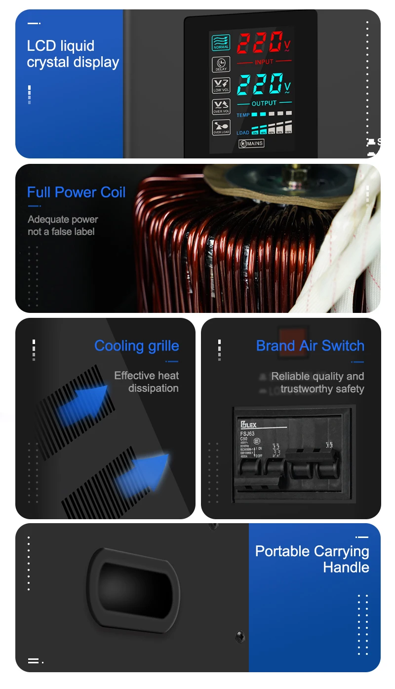 3.Widely used in the field of electric power which needs to stabilise voltage, it is an ideal voltage stabilisation power supply to ensure the normal operation of your electrical equipment.