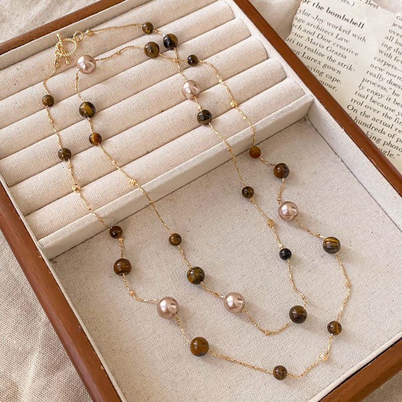 double-layer beaded oval tigereye pendant necklace-about 46cm
