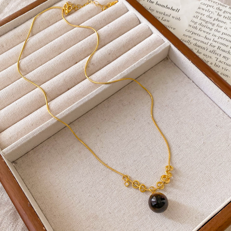 round tigereye pendant small golden balls necklace-circumference about 64cm