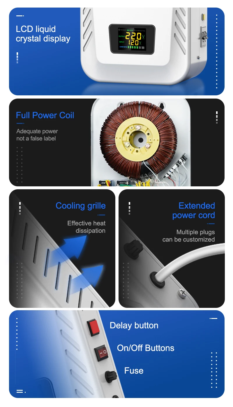 3.Widely used in the field of electric power which needs to stabilise voltage, it is an ideal voltage stabilisation power supply to ensure the normal operation of your electrical equipment.
