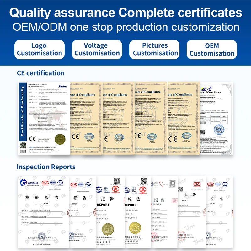 Q1: What is the Guarantee? A1: Within One Year From The Sale Date, If There Are Any Accessory Problems,You Just Provide The Photos Of Damaged Accessory, Then We Will Provide Free Accessory.According To The Number Of Products, We Will Provide Easily Damaged Accessories For Free.We Also Can Provide Technical Support If You Need. Q2: Can we put/show our own Logo on your products? A2: Yes, no problem, however, the quantity should be a bit big. Q3: Is OEM/ODM available? A3: Yes, It Is! Our Products Can Be Customized.We Design And Produce All Kinds Of Automatic Voltage Regulators/Stabilizers According To Our Customers’ Specific Requirements. Q4: What is the MOQ? A4: For the small capacity products (Automatic Voltage Regulators/Stabilizers) of the default configuration, it is 10 sets. For the big capacity products, it is 1 set. Q5: Can you offer Form A or Form E or C/O ? A5: Yes, no problem, we can apply for it from our local government. Q6: What kind of Certificates do you have? A6: CE, ISO9001 and SGS. Q7: What is the Terms of Payment? A7: L/C, T/T, D/P, D/A, Western Union and MoneyGram (for Small-amount payment).