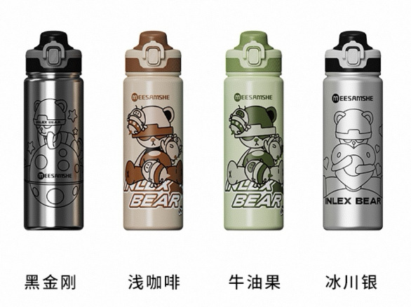 MEESAMSHE/米膳师*引力熊IP联名款保温杯, the inner lid is made of SUS316 medical grade stainless steel, the cup cover is equipped with a handle for convenient carrying, and it is a one-button pop-up sports water cup. The cup body is printed with 3D/UV patterns, making it very convenient to carry. It is equipped with a stainless steel tea strainer and a non-slip silicone pad at the bottom. There are four colors to choose from: Black King Kong, Cherry Red, Glacier Silver, and Ivory White. This vacuum water cup maintains the temperature for 8-12 hours. It supports OEM/ODM gift customizations and is a hot sale for group purchases. It is also equipped with a straw for outdoor use.