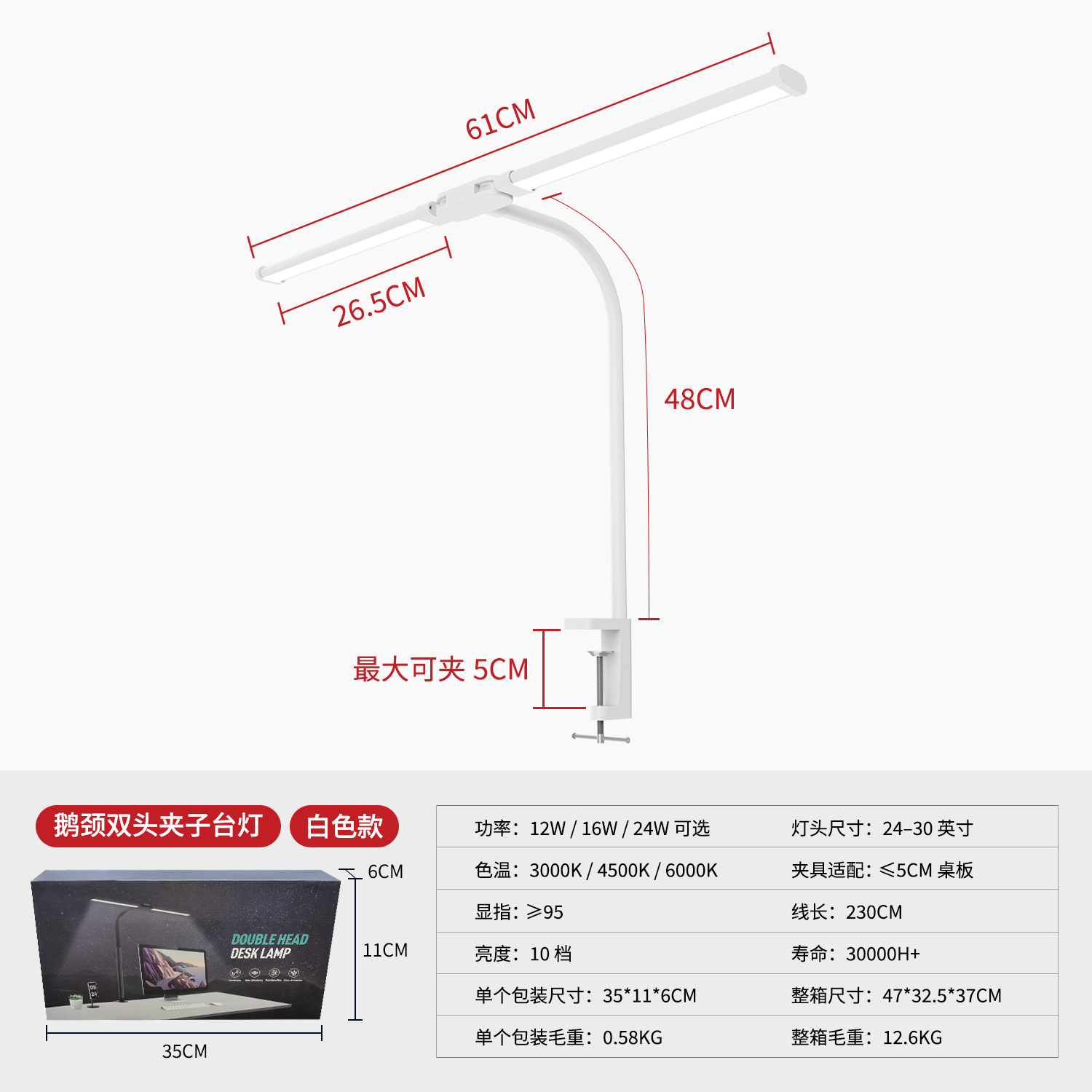 [the lamp holder can rotate 360 degrees] [super long 61cm lamp holder full desktop coverage + new material upgrade] double-headed clip lamp white
