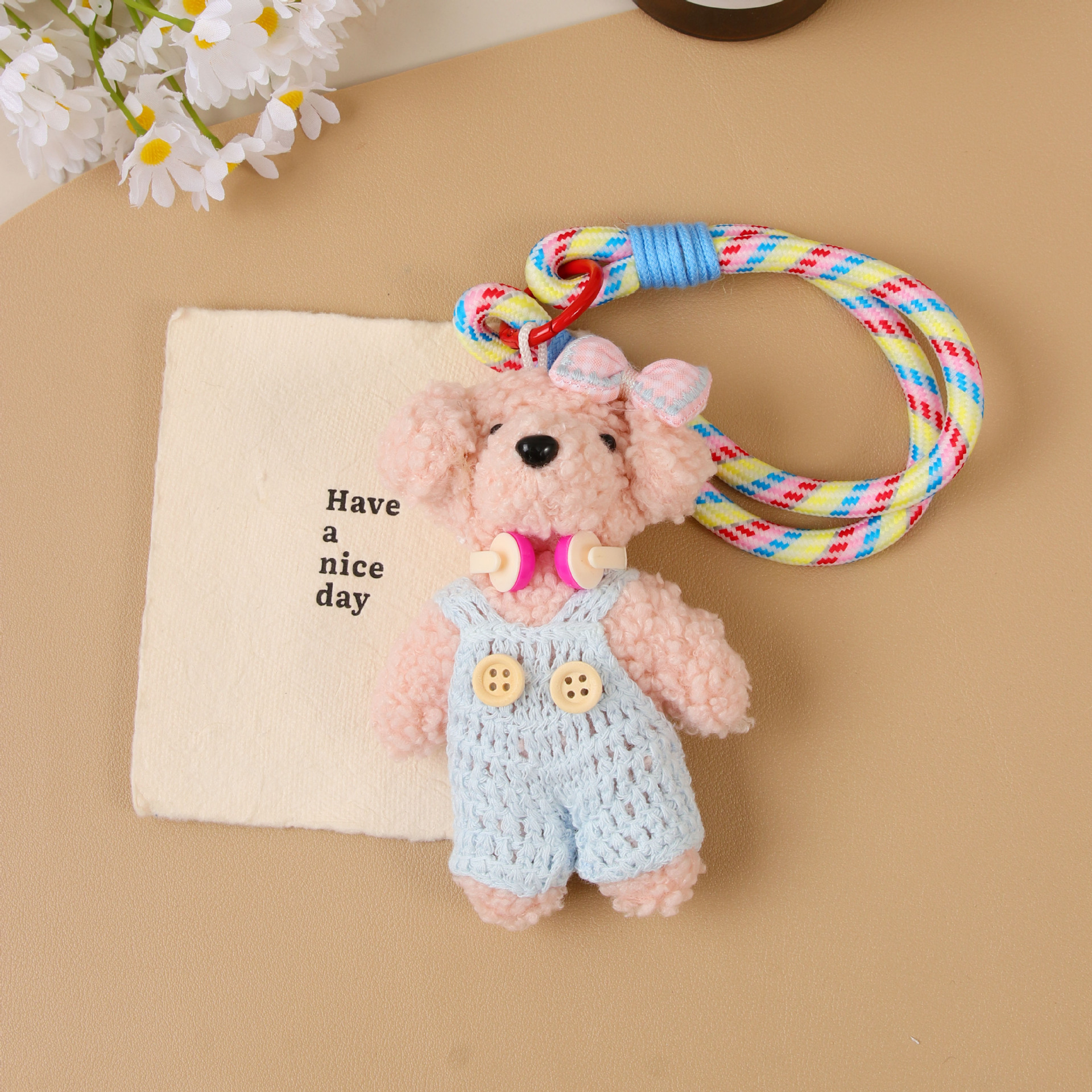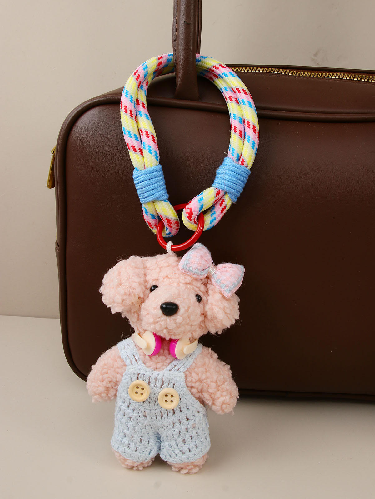 blue suspender pants pink dog
