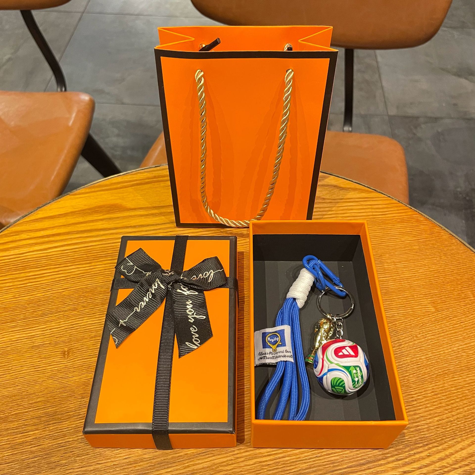 world cup football + fifa world cup + blue grenadine rope + orange large size gift box + gift bag
