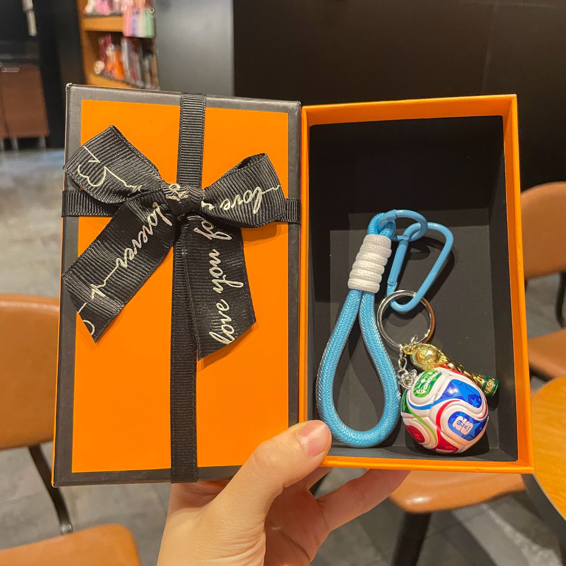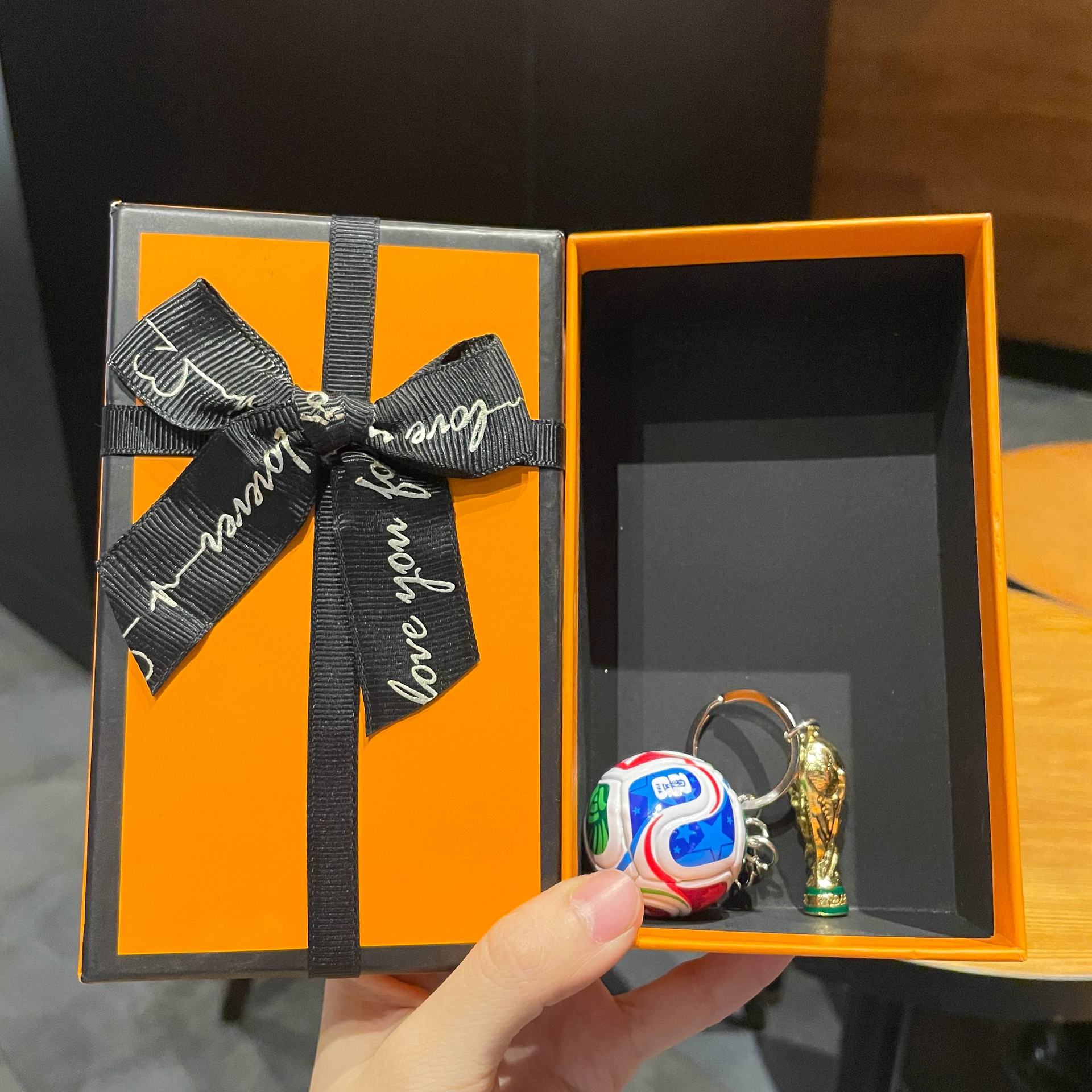 world cup football + fifa world cup + blue grenadine rope + orange large size gift box