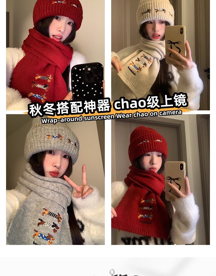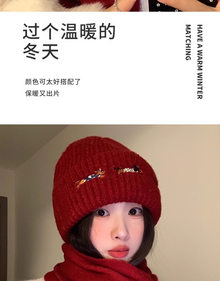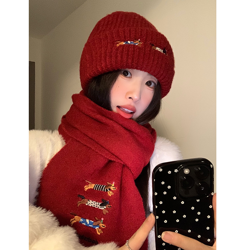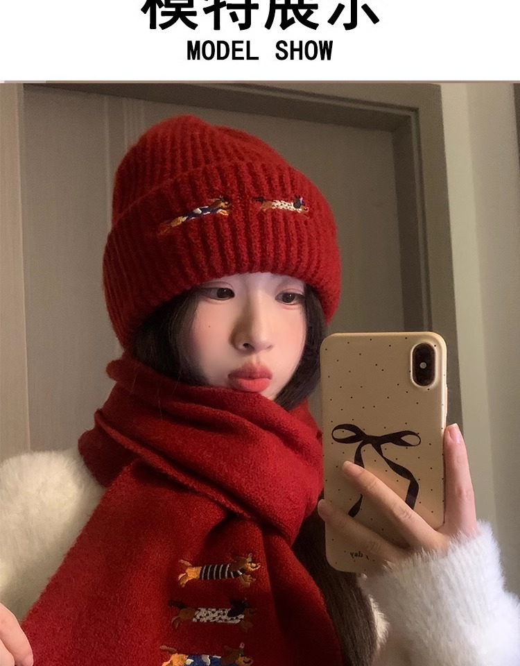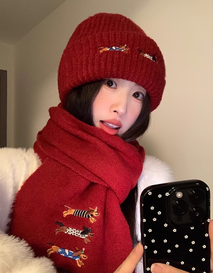 three sausage dog sets [scarf + hat] wine red