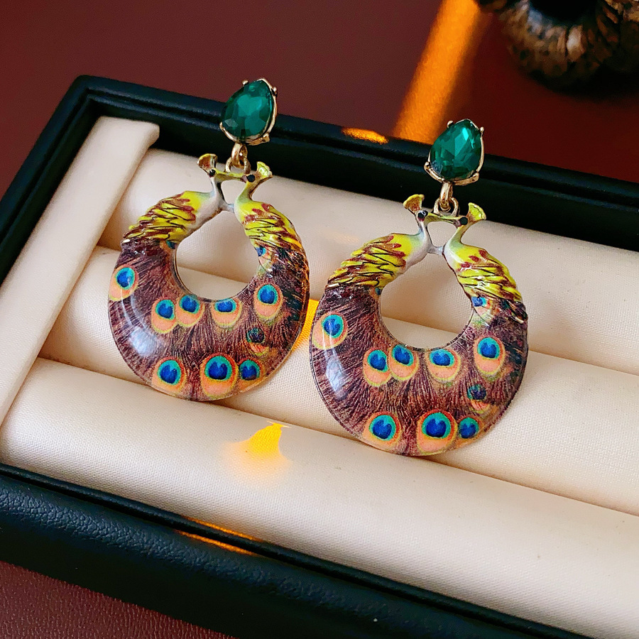 30# silver needle-golden-green-yellow-dripping oil painted peacock openwork circle ear studs