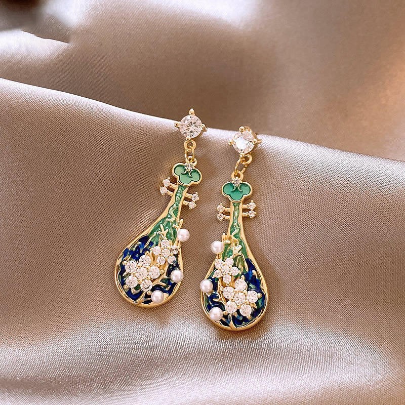 46# silver needle-golden-green-blue-pipa flower rhinestone-embedded pearl stud earrings