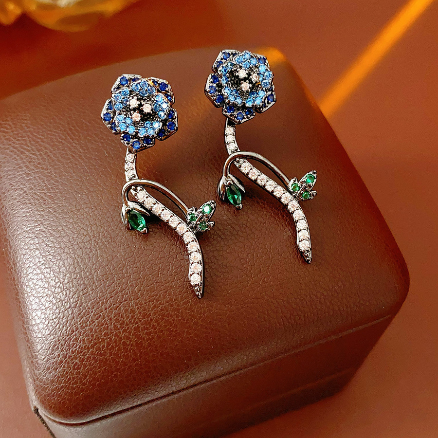 12# silver needle-gun black-blue-zircon flower leaves eardrops stud earrings