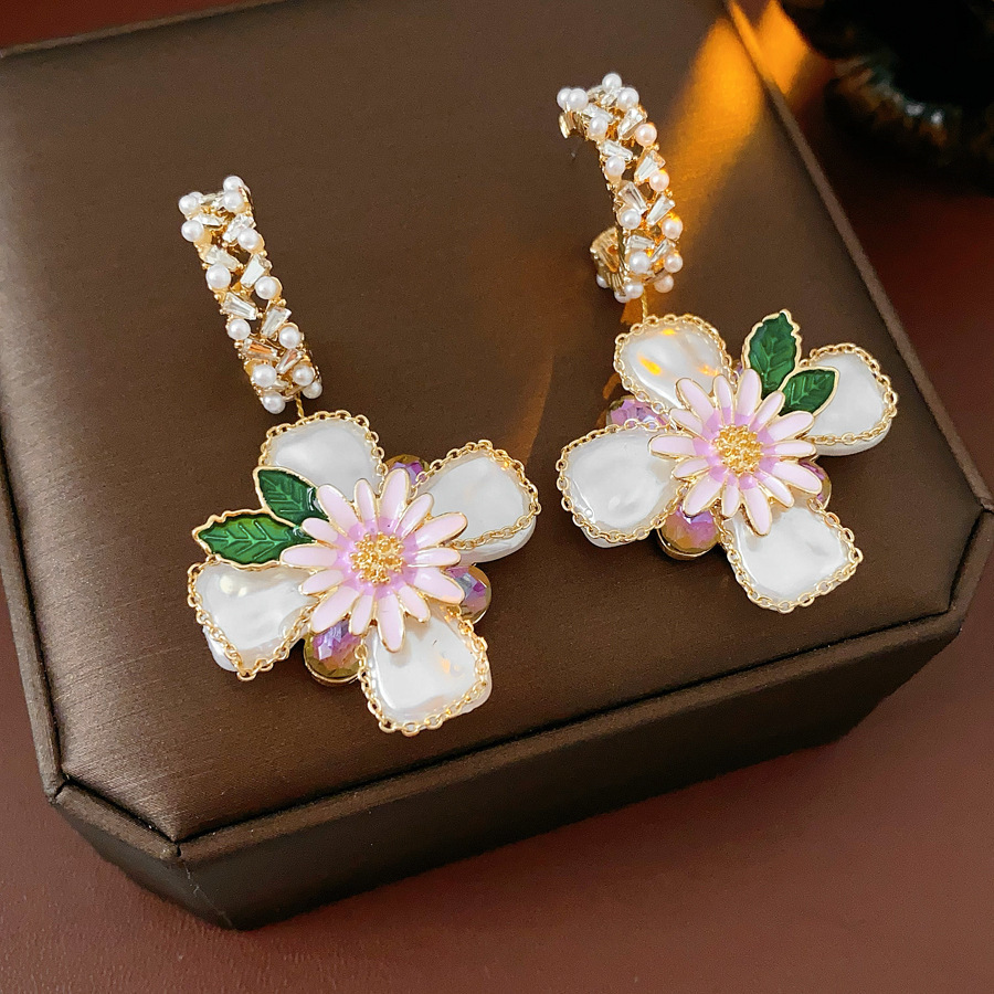 19# silver needle-golden-white-green-rhinestone pearl oil-spot glaze flowers pendant c- shaped stud earrings