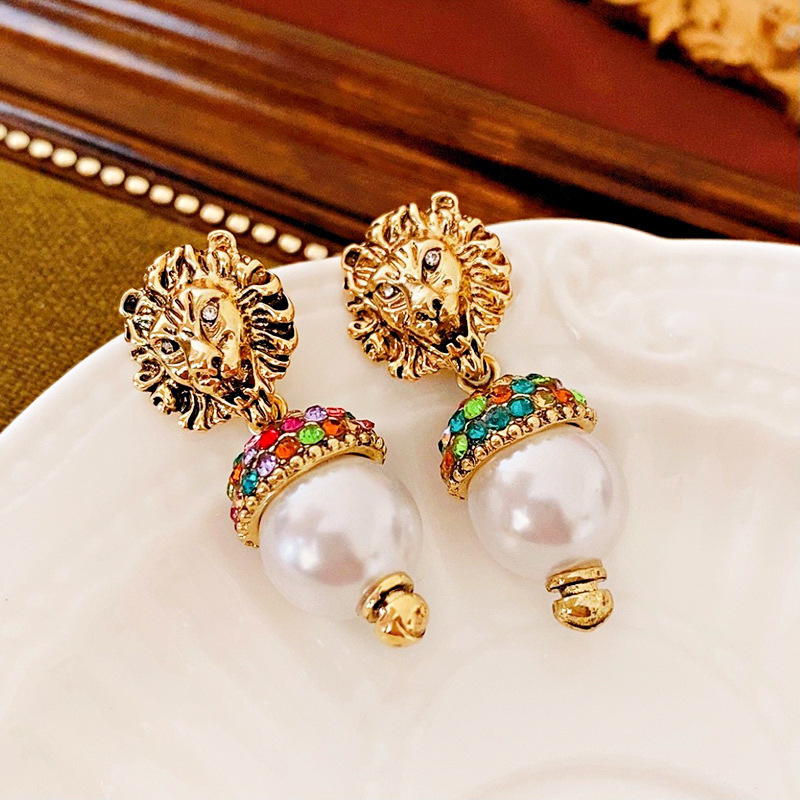 15# silver needle-golden-color-diamond lion's head pearl stud earrings