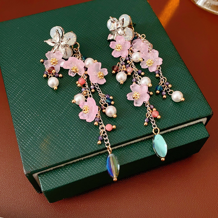9# silver needle-silver-pink-blue-diamond resin flower glass pearl tassel earrings