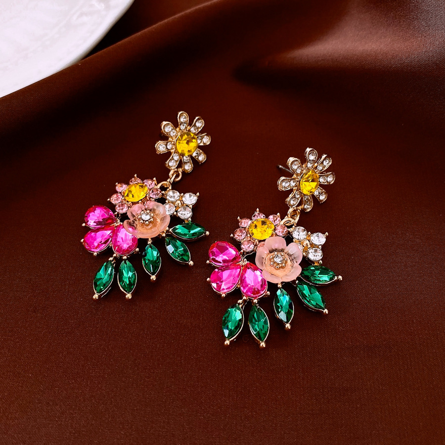 7# silver needle-golden-pink-green-diamond color flower stud earrings