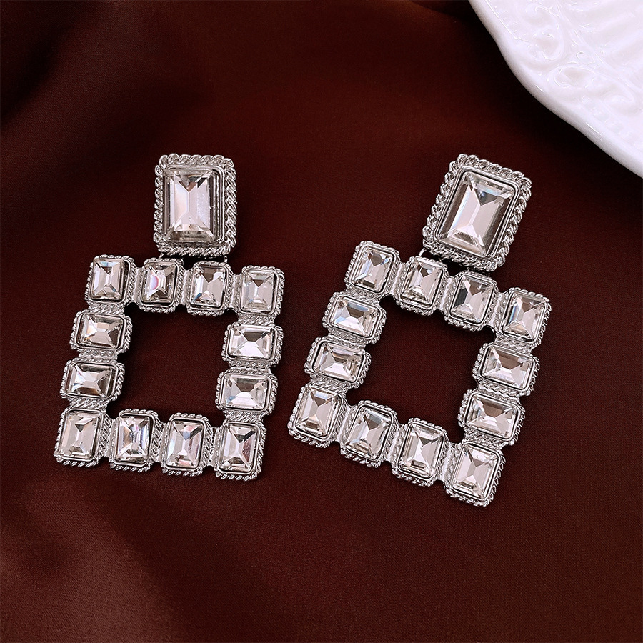 21# silver needle-silver-white-diamond square hollow eardrops stud earrings