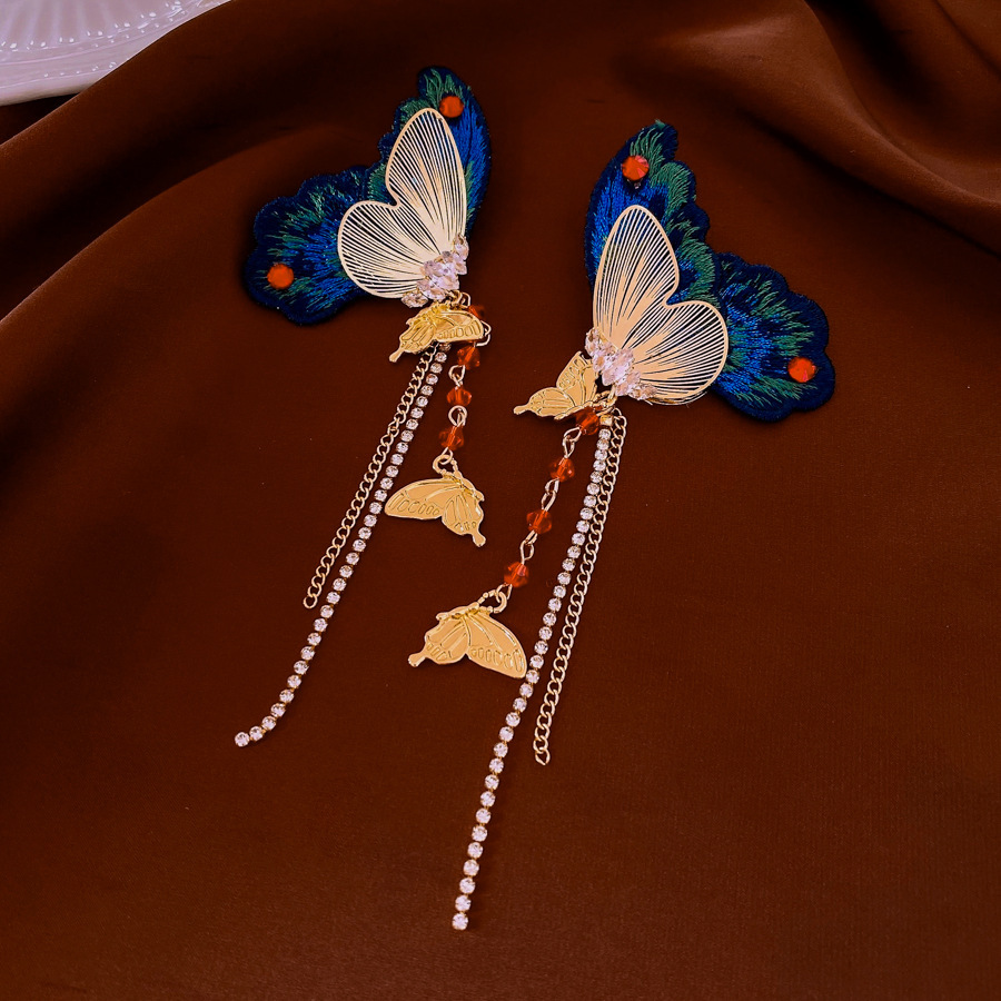 silver needle-wool woven zircon butterfly wings diamond tassel ear studs