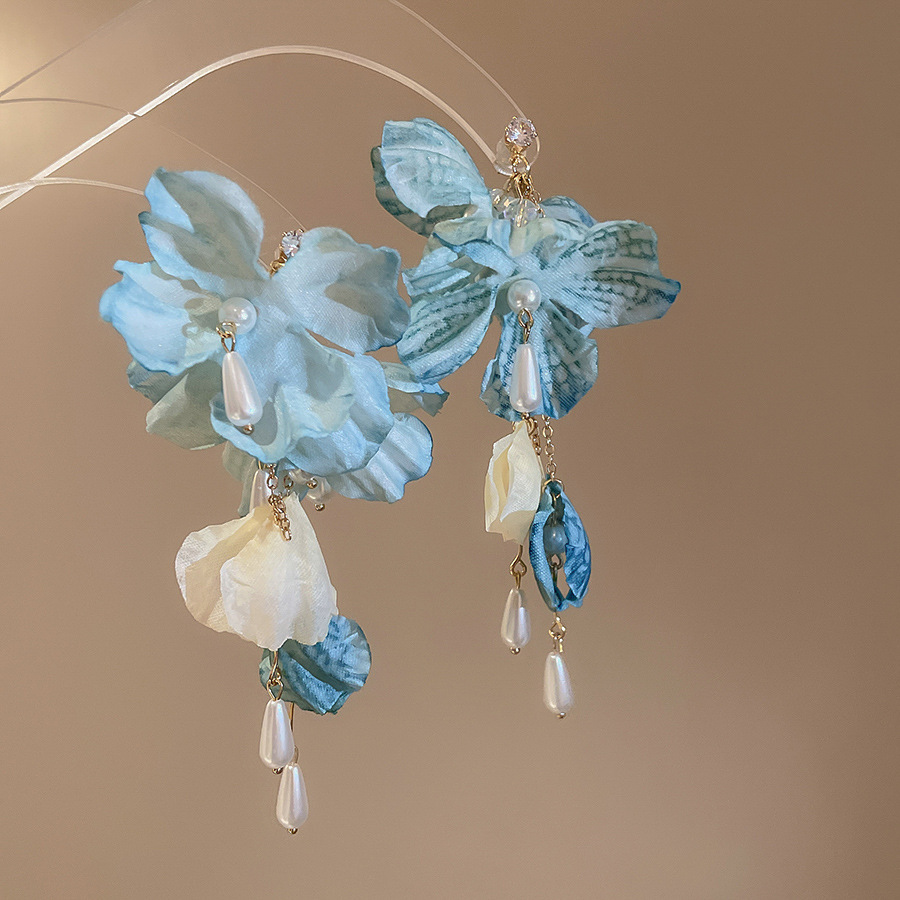 16# silver needle zircon fabric flower pearl waterdrop tassel earrings