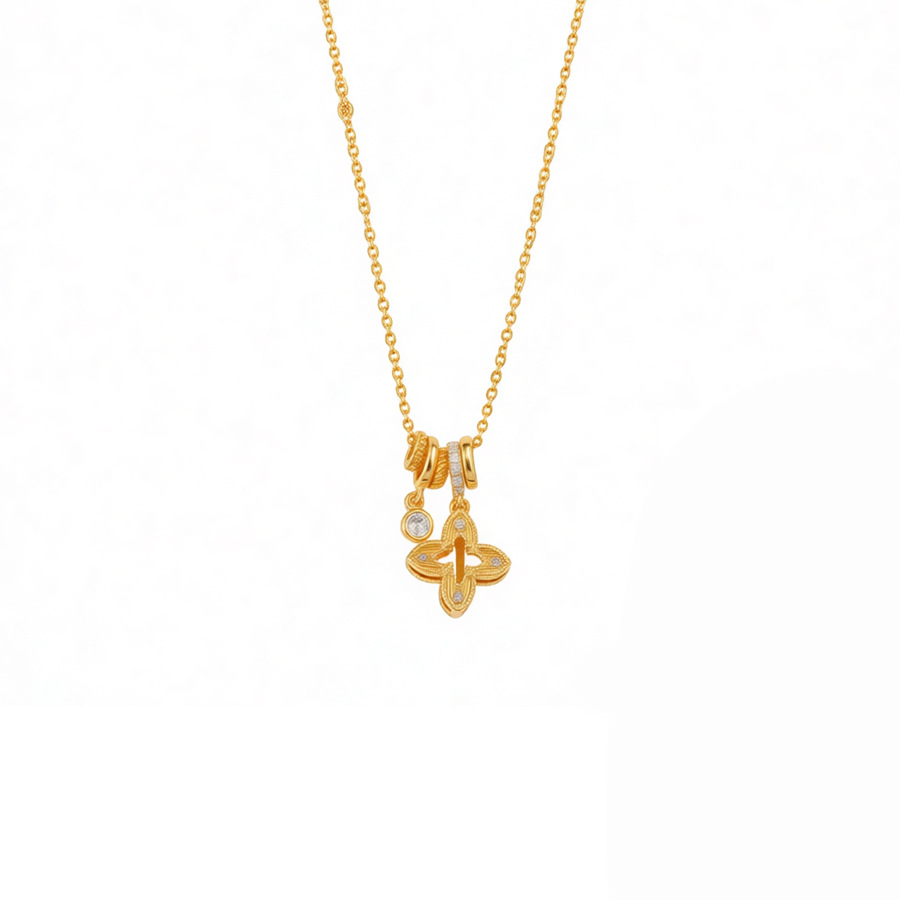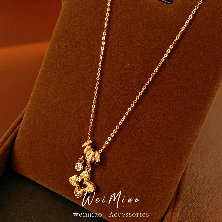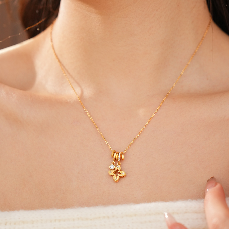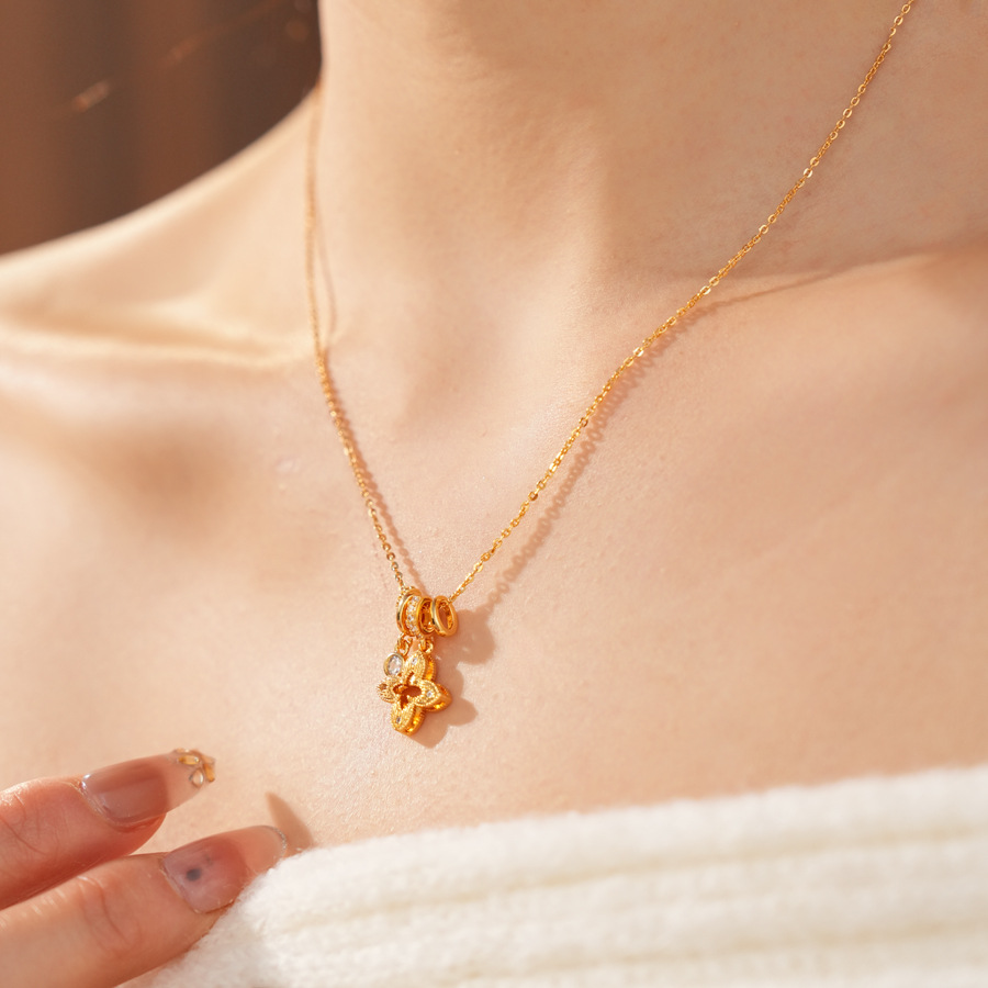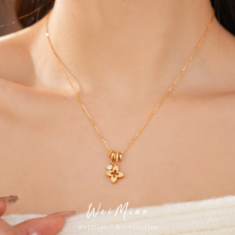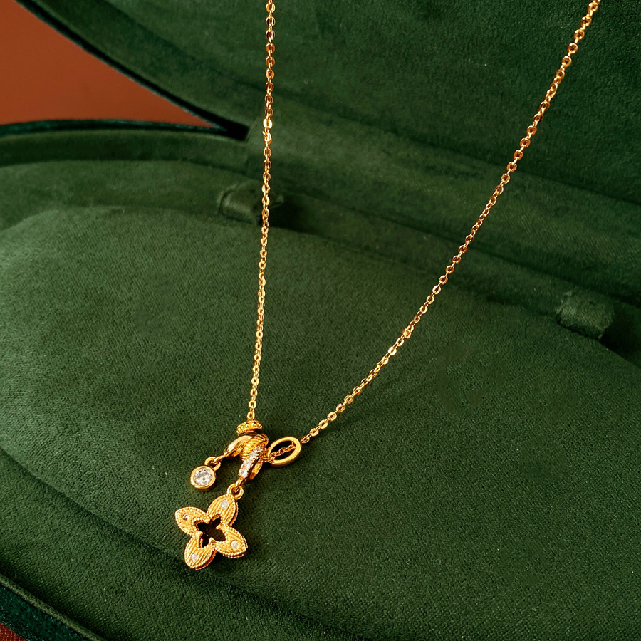 gold sparking zirconium hollow diamond four-leaf flower pendant necklace women's real gold plating design sense fashion exquisite necklace women