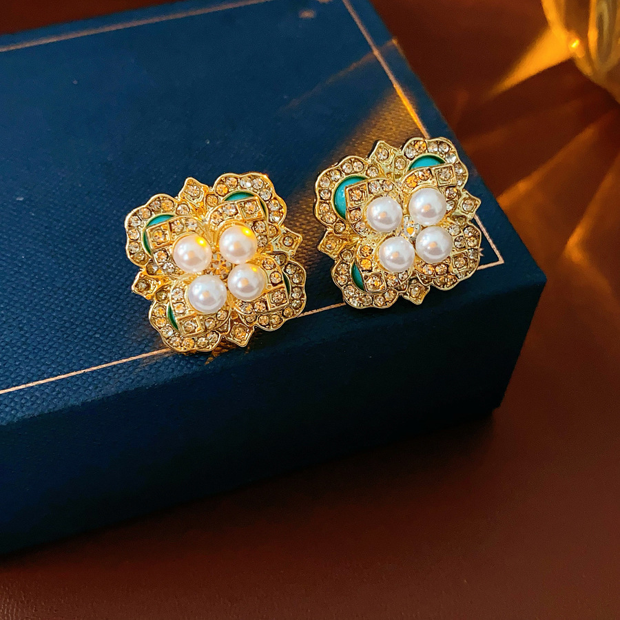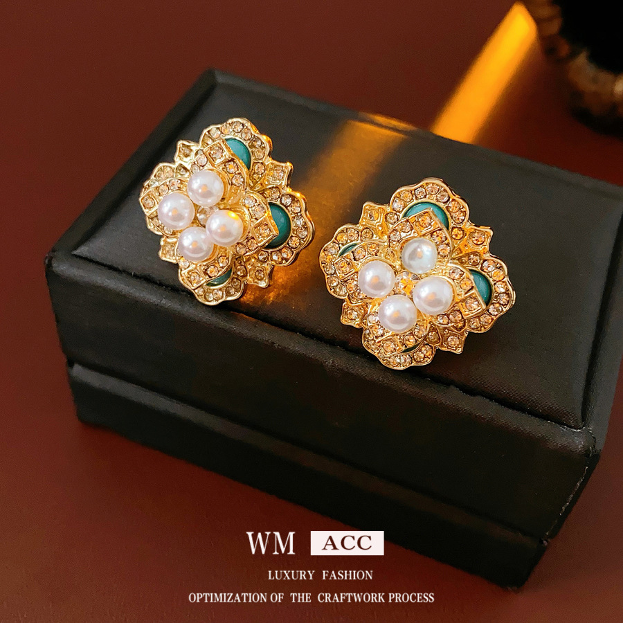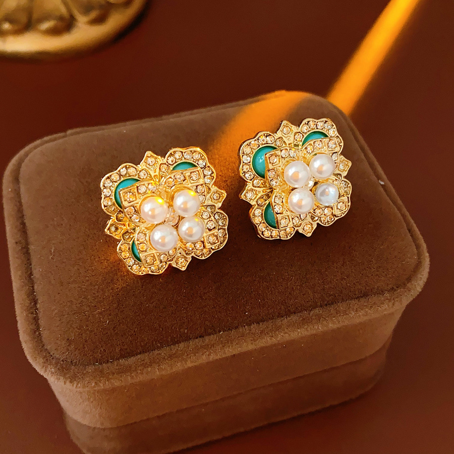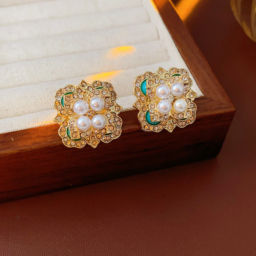 mid-ancient vintage light luxury earrings silver stud rhinestone-encrusted flower square pearl earrings high sense vintage earrings women