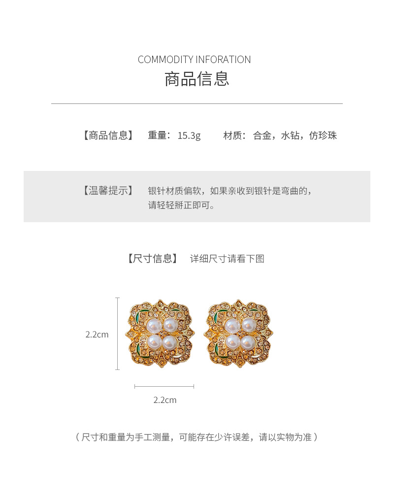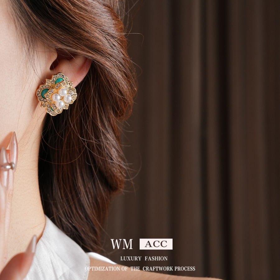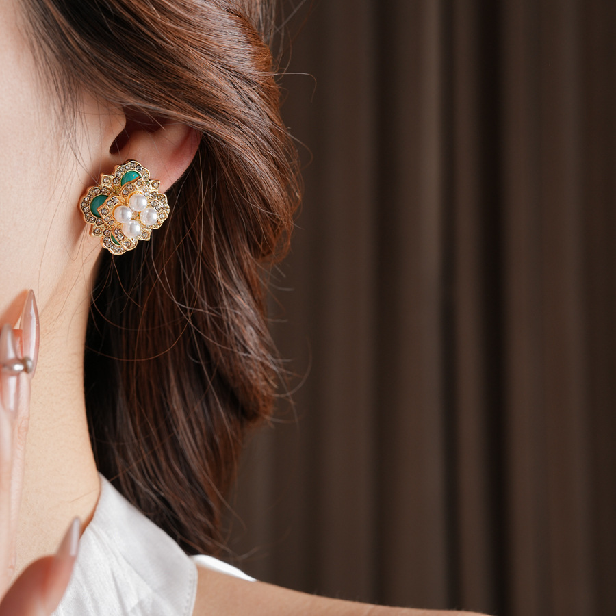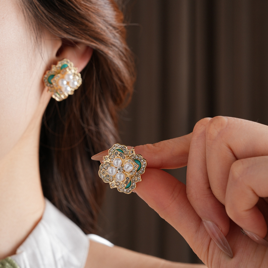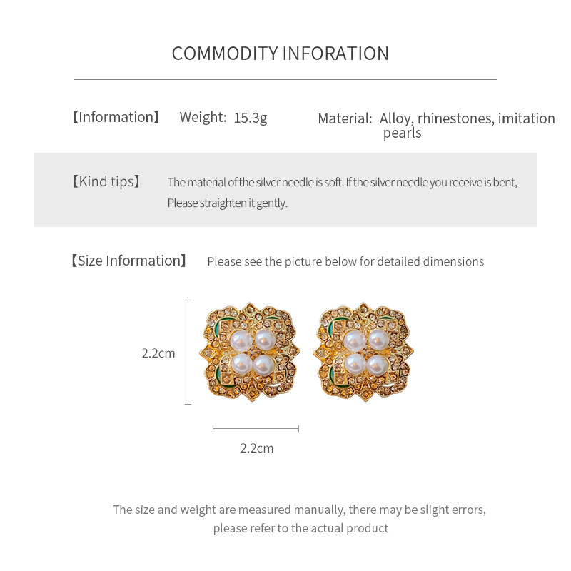 mid-ancient vintage light luxury earrings silver stud rhinestone-encrusted flower square pearl earrings high sense vintage earrings women