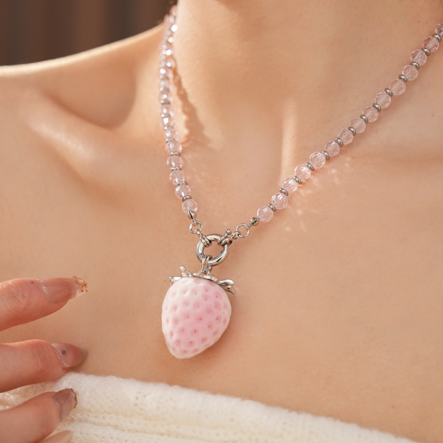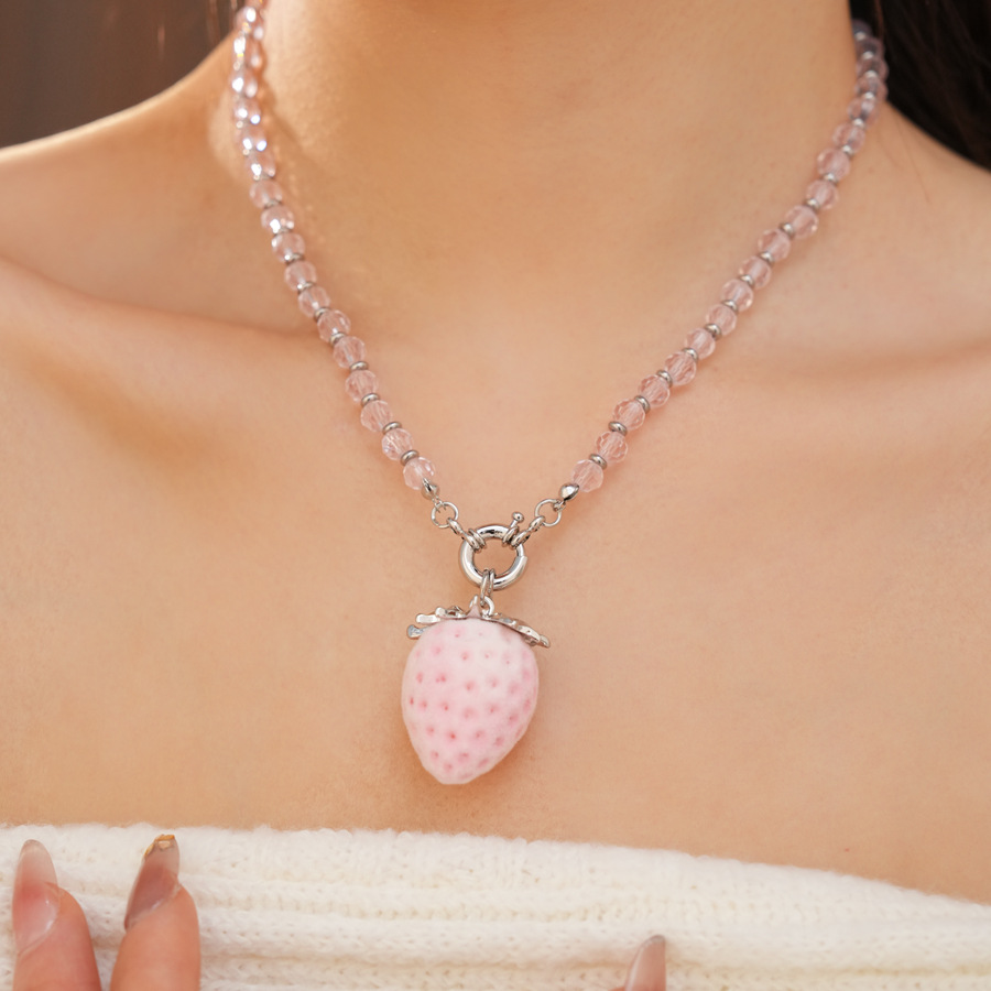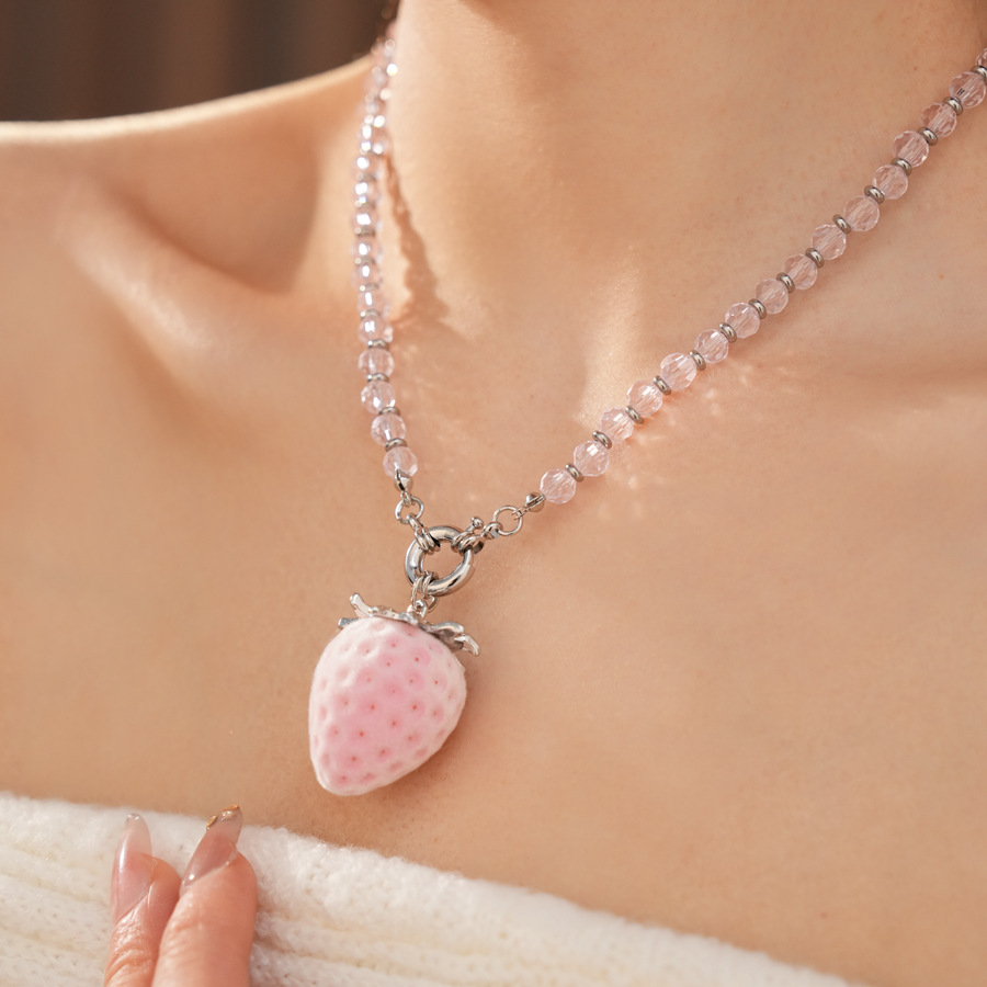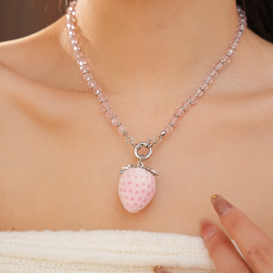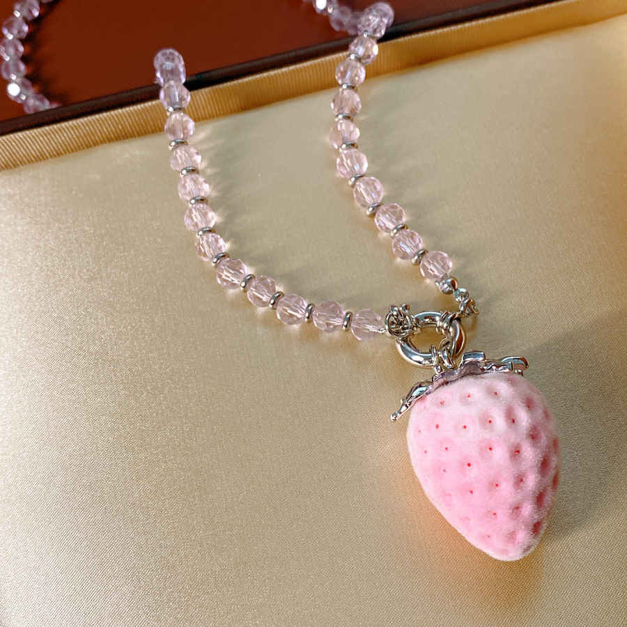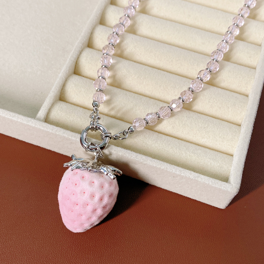 silver-pink glass beaded flocking strawberry pendant fashion necklace