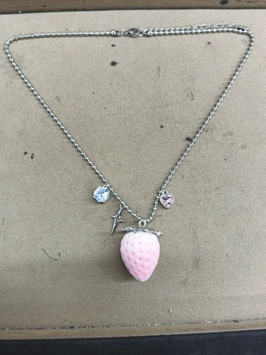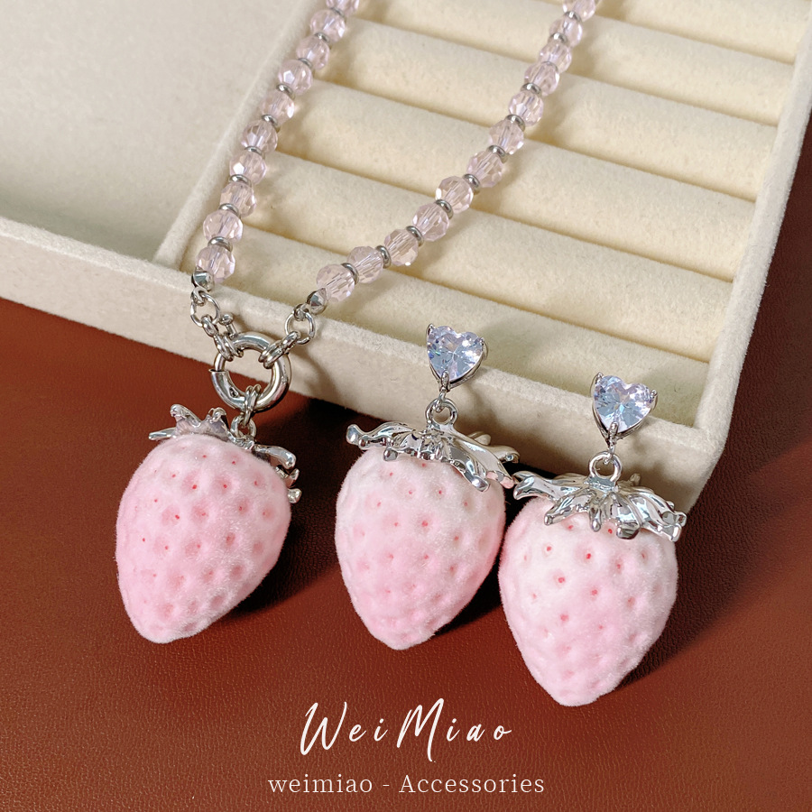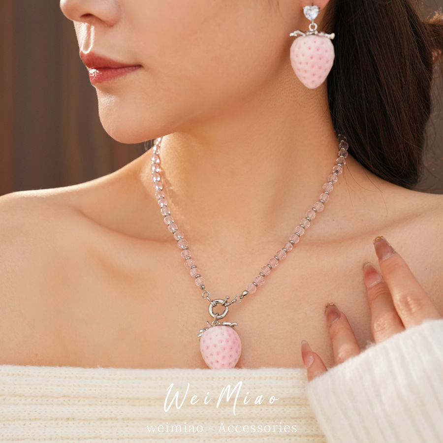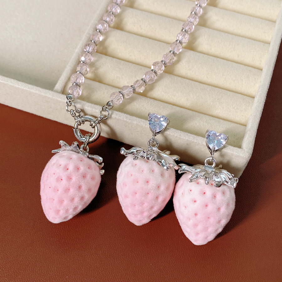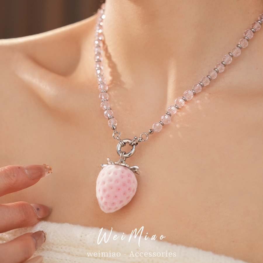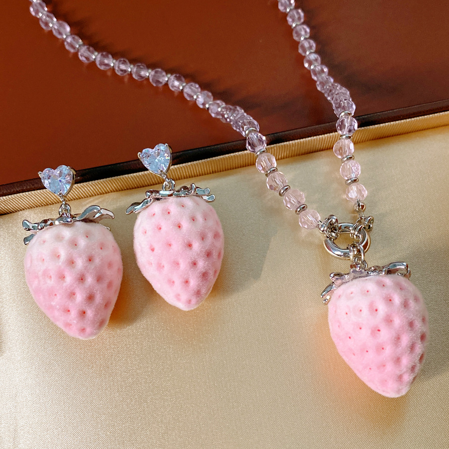 silver-pink glass beaded flocking strawberry pendant fashion necklace
