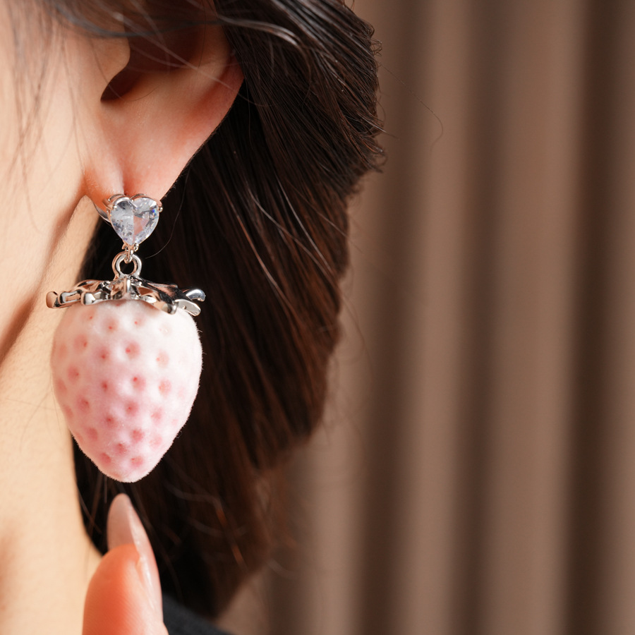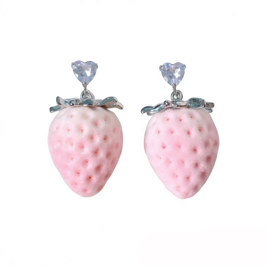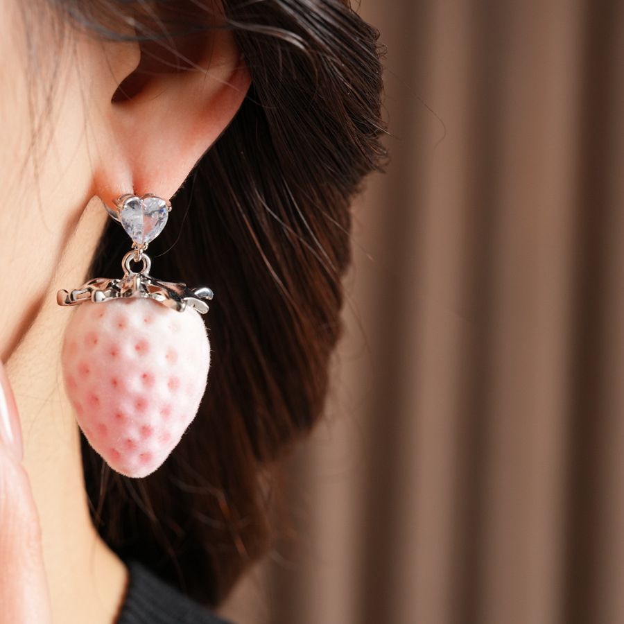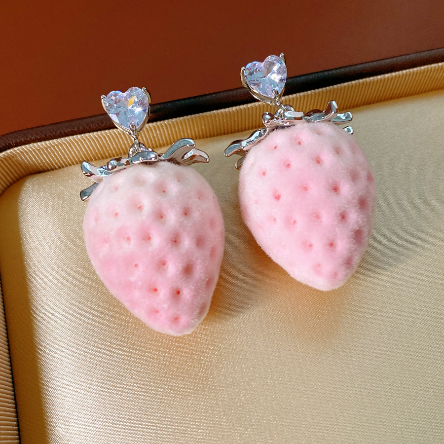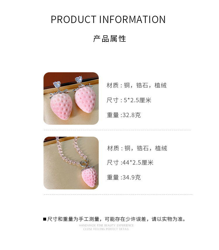 silver-pink stainless steel heart-shaped zircon flocking strawberry pendant fashion necklace