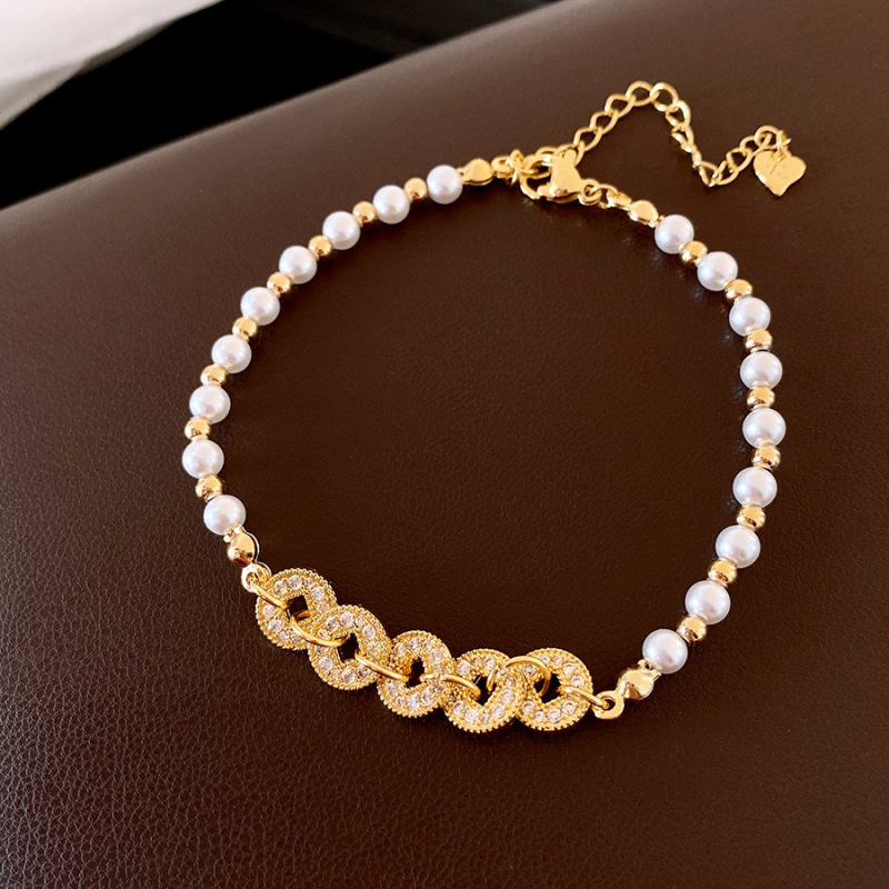 golden-pearl zircon copper coin beaded bracelet