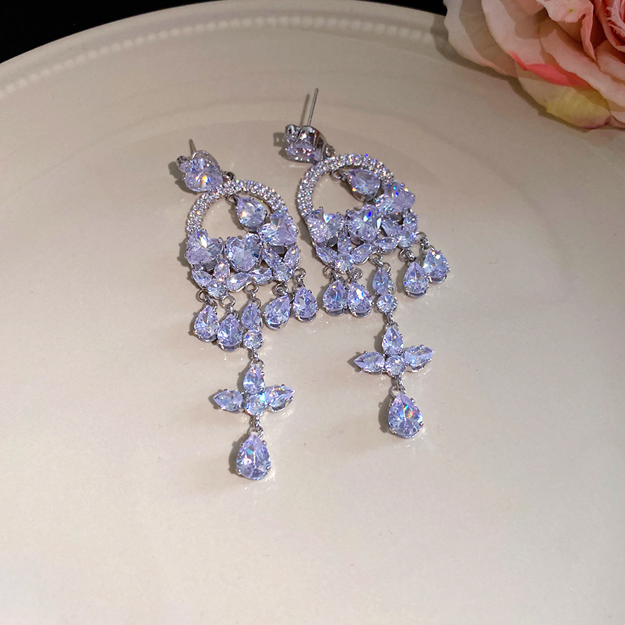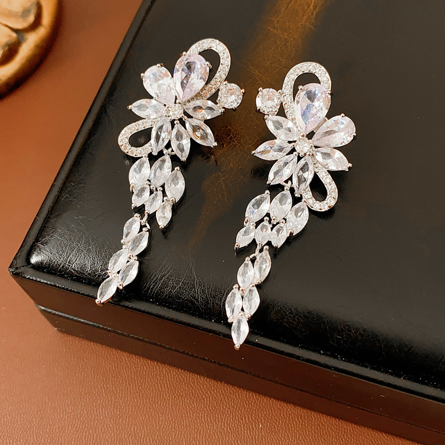 30# silver needle-zircon flower tassel pendant ear studs