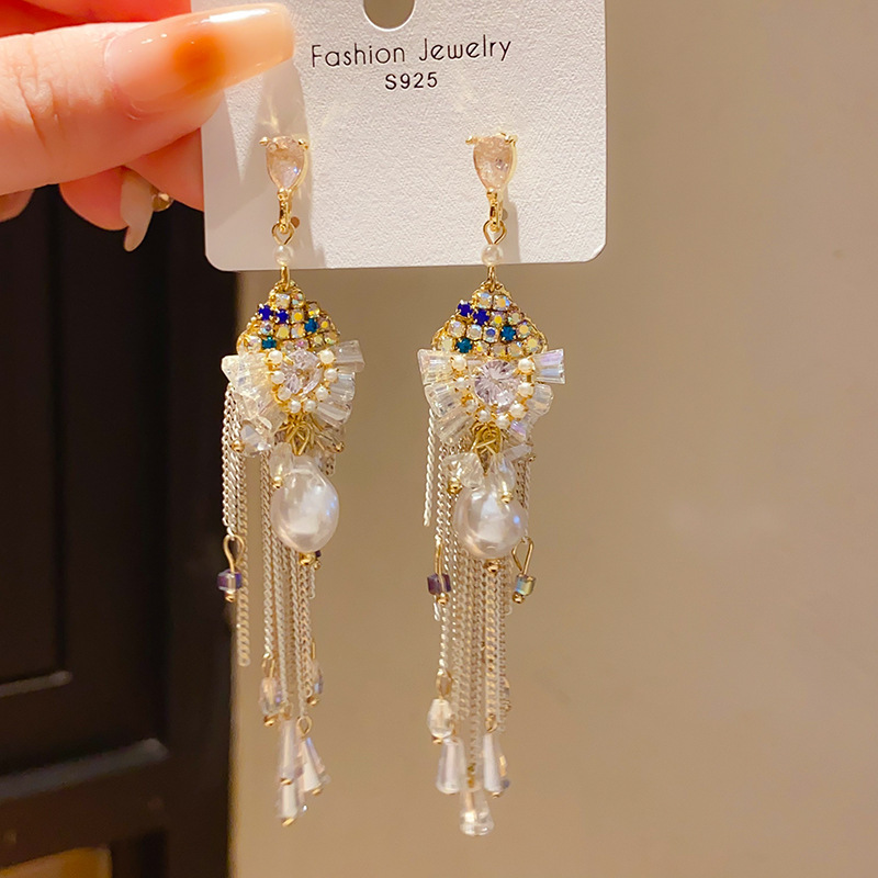 9# silver needle-diamond drop tassel ear studs