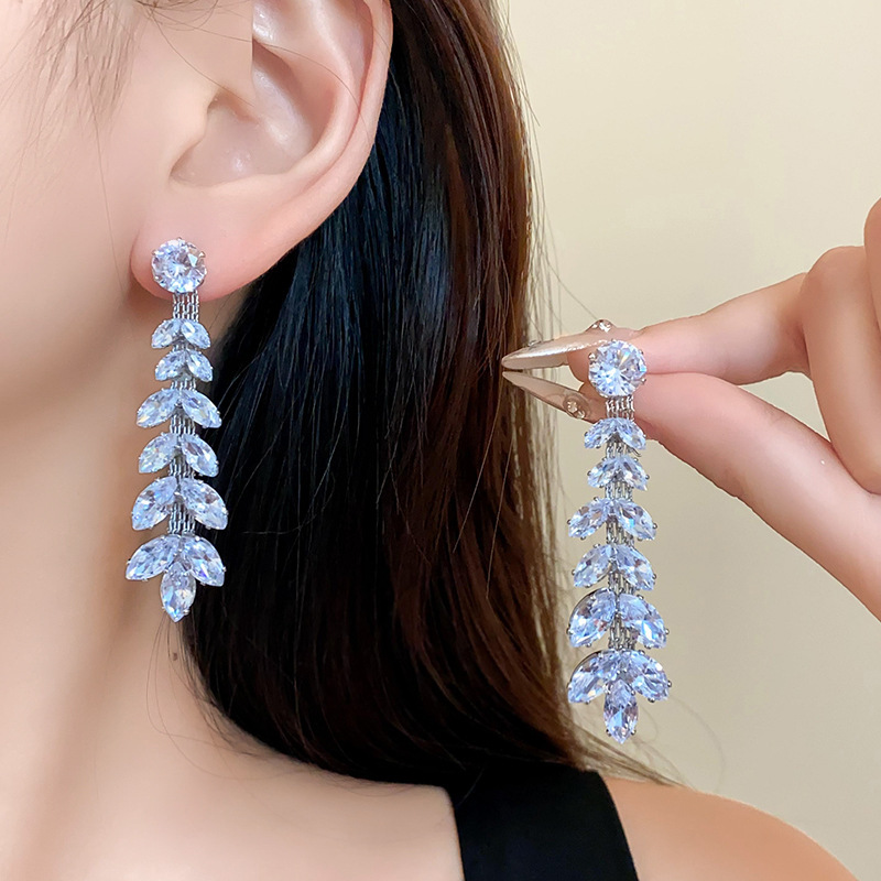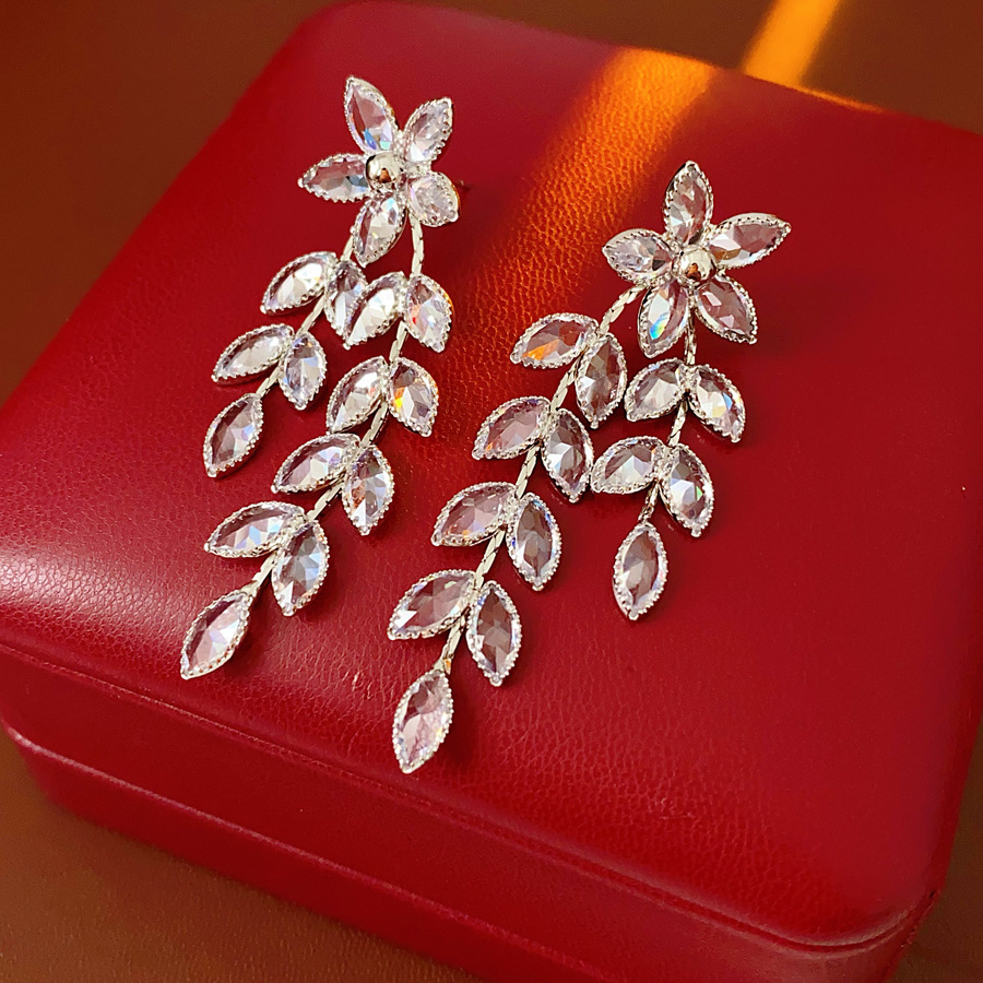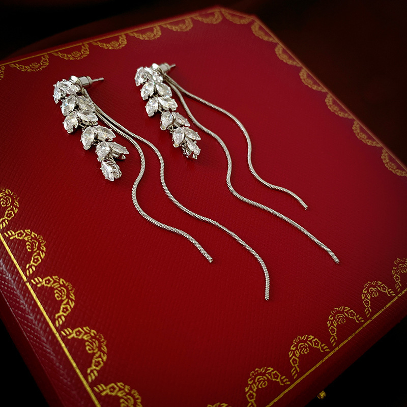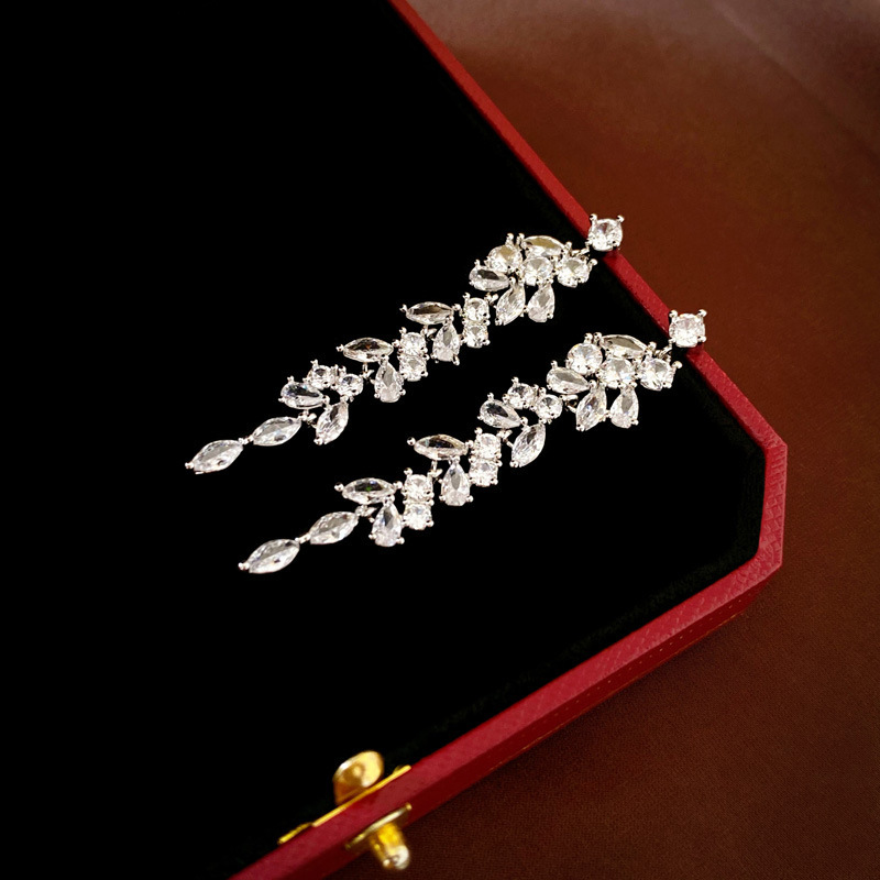 8# silver needle-zircon branch water drop tassel ear studs