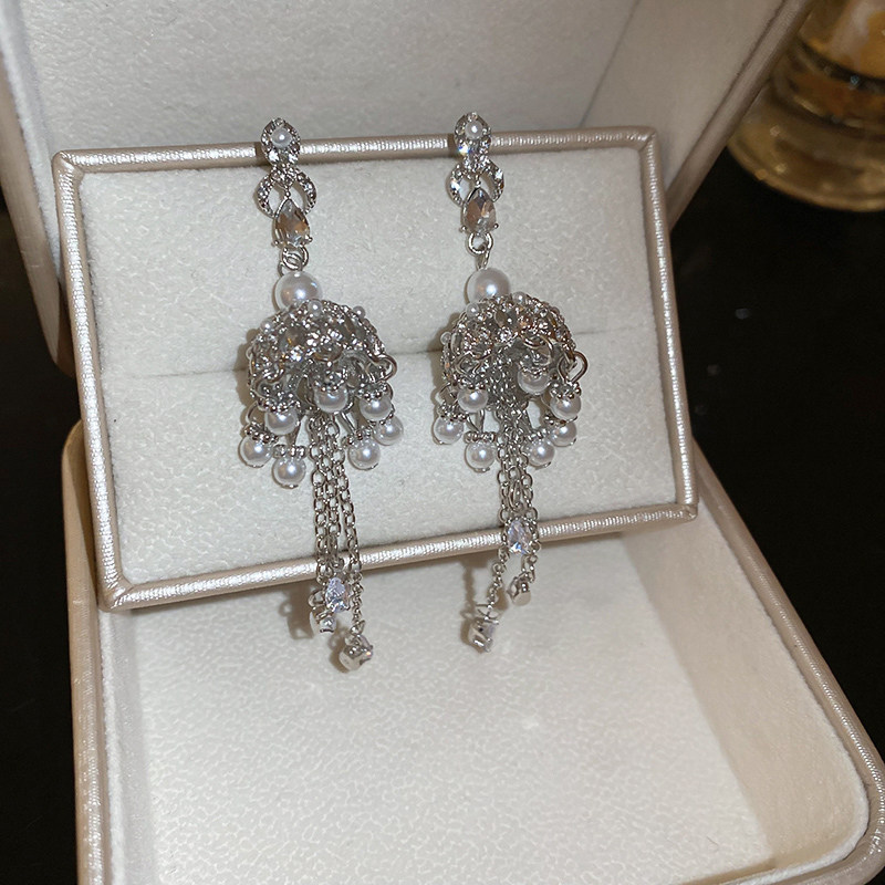 16# silver needle-rhinestone zircon pearl water drop lantern tassel stud earrings