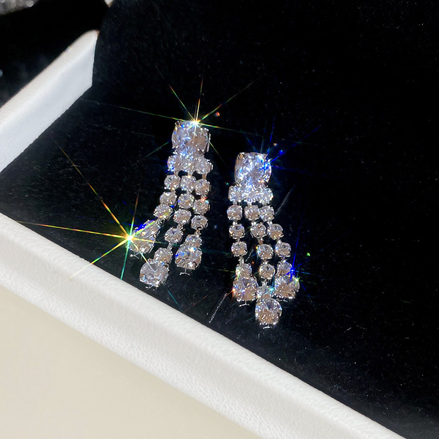 24# silver needle-zircon diamond rectangular tassel earrings