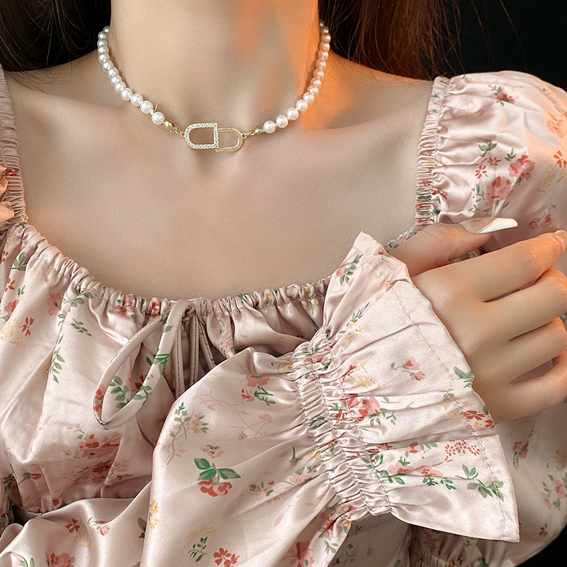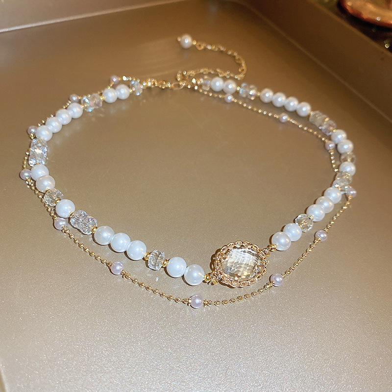 oval pearl square crystal double-layer necklace