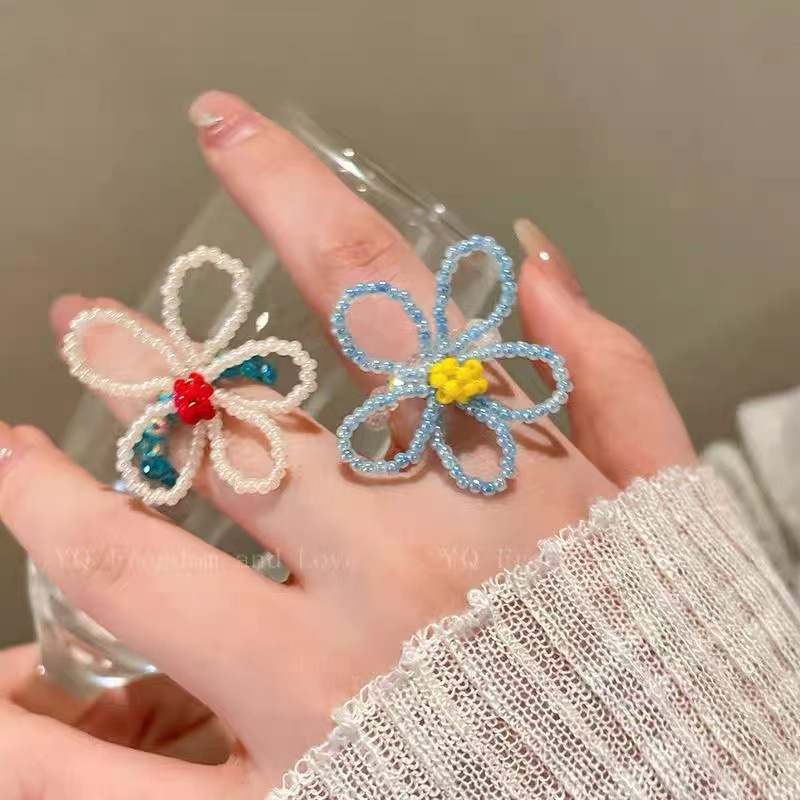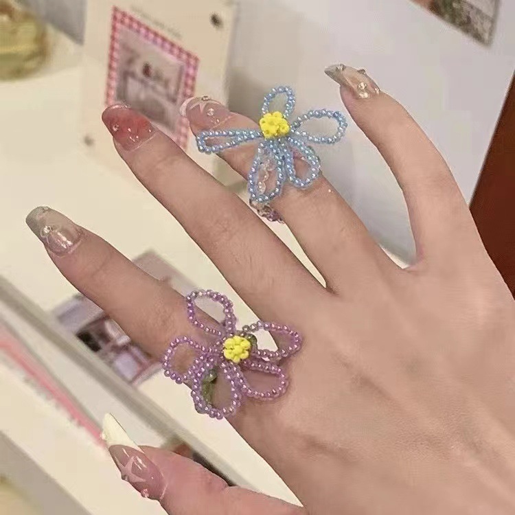 red floral blue and white beaded ring