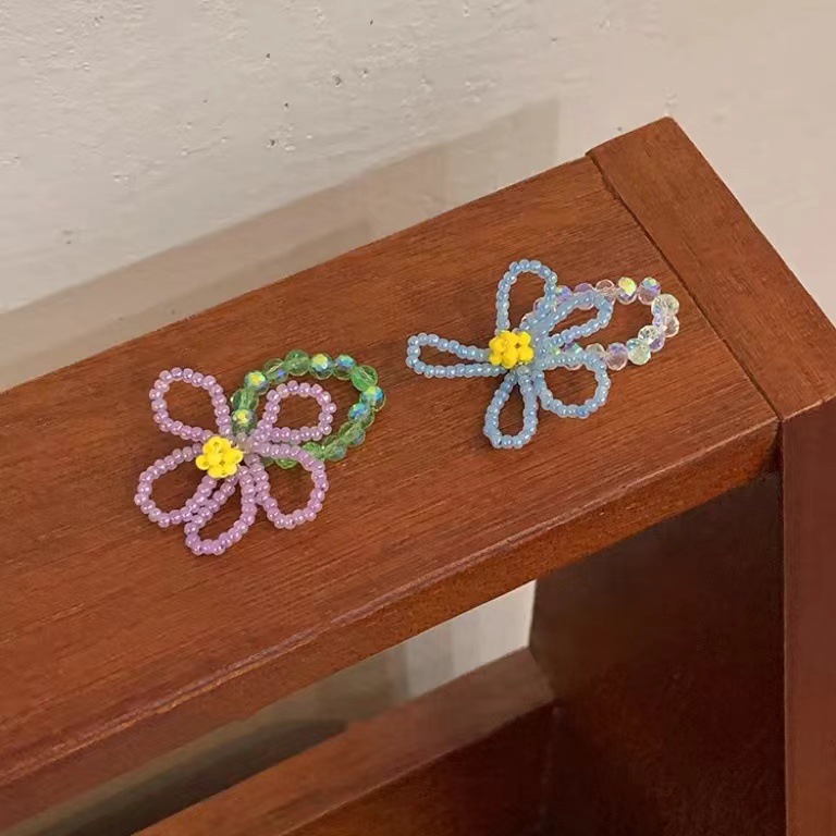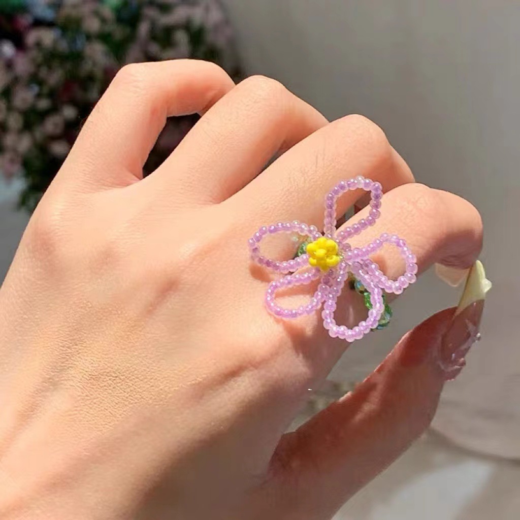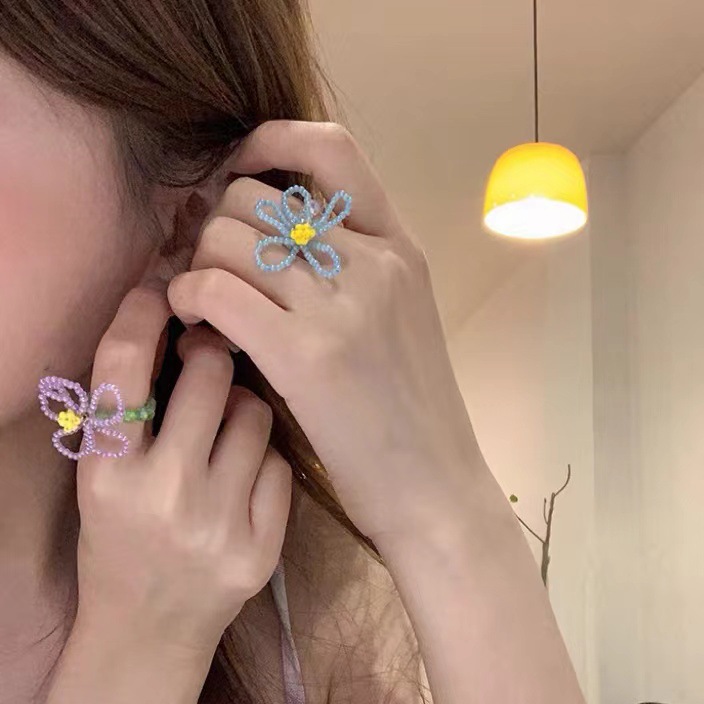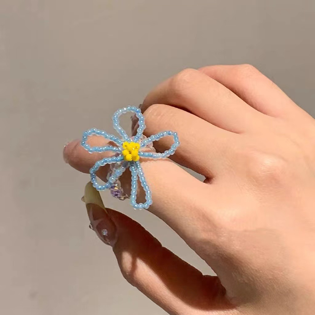 yellow floral blue and white beaded ring