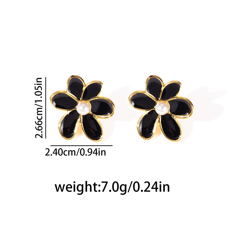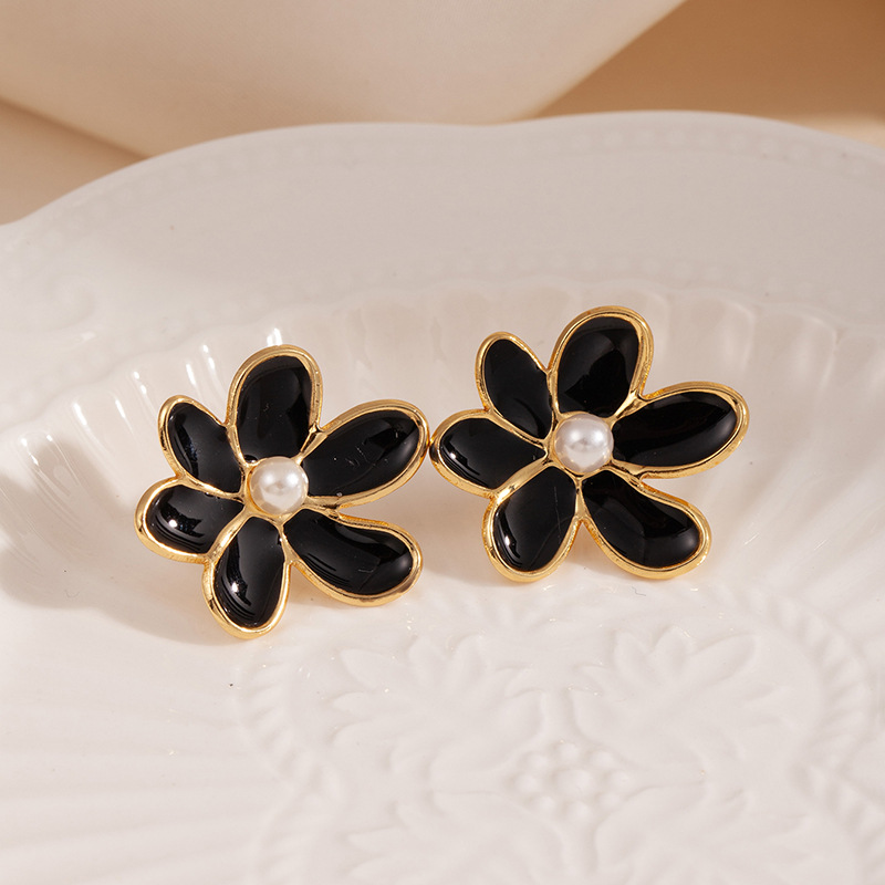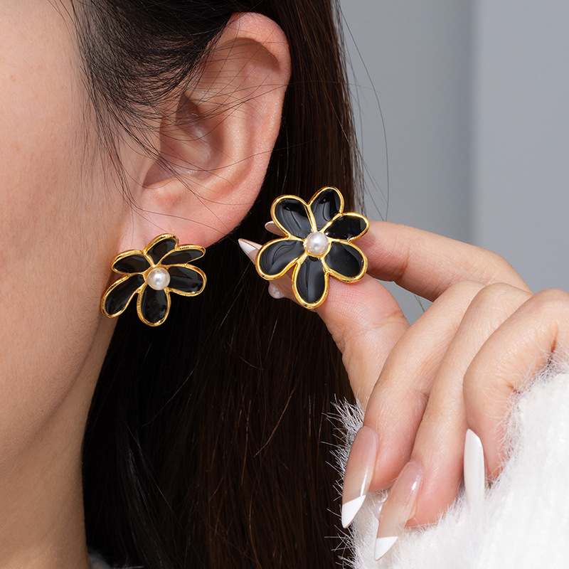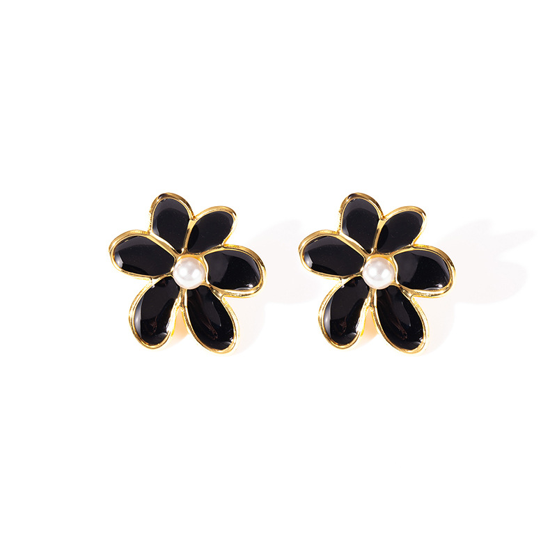 flower pearl stud earrings-black 1811