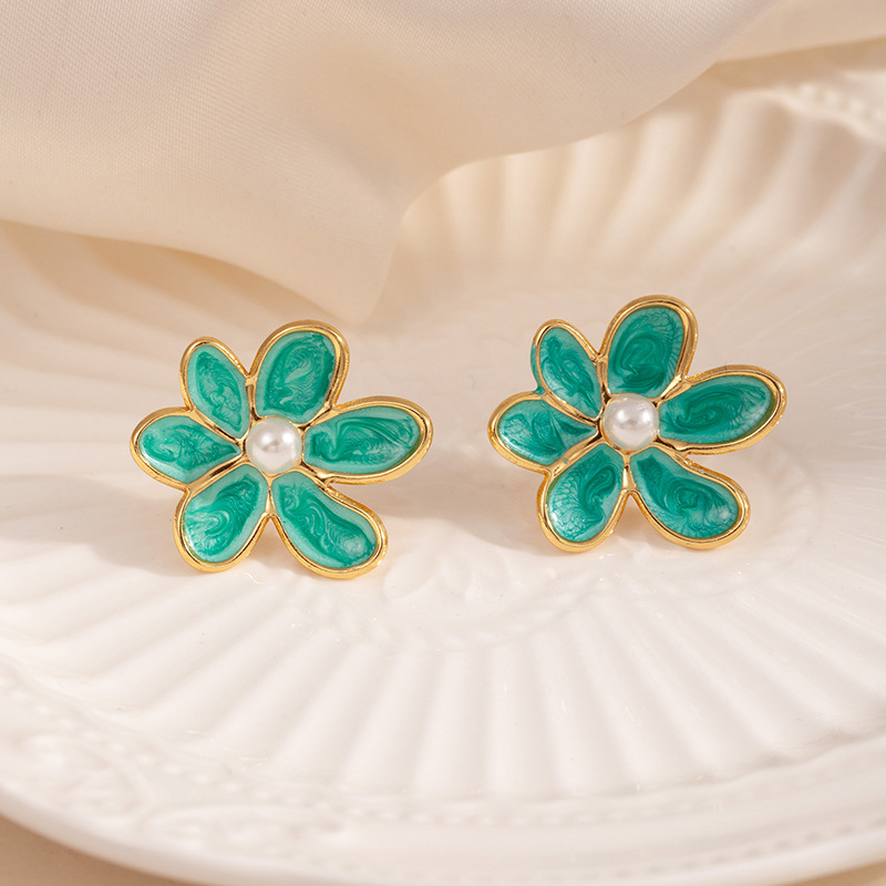 flower pearl stud earrings-green 1813