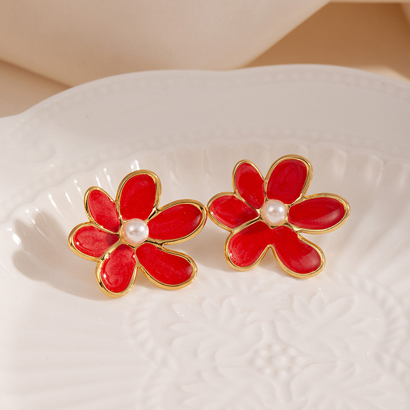 flower pearl stud earrings-red 1814