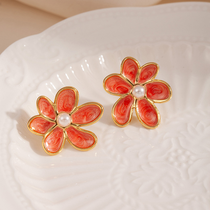 flower pearl stud earrings-orange 1812