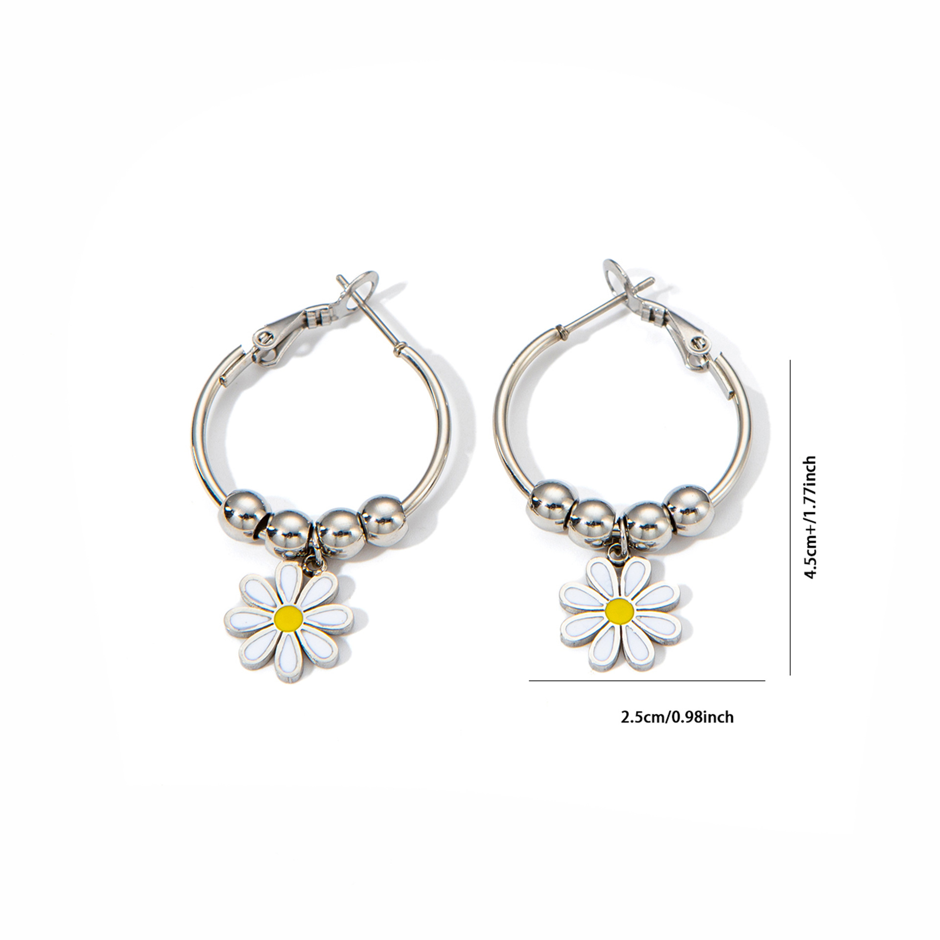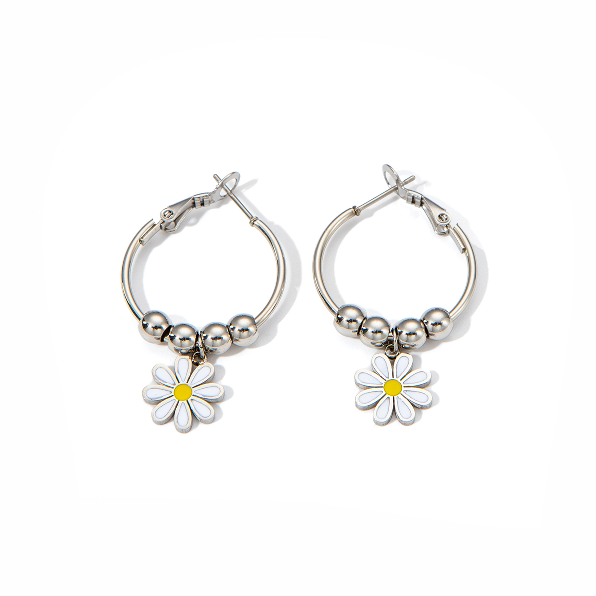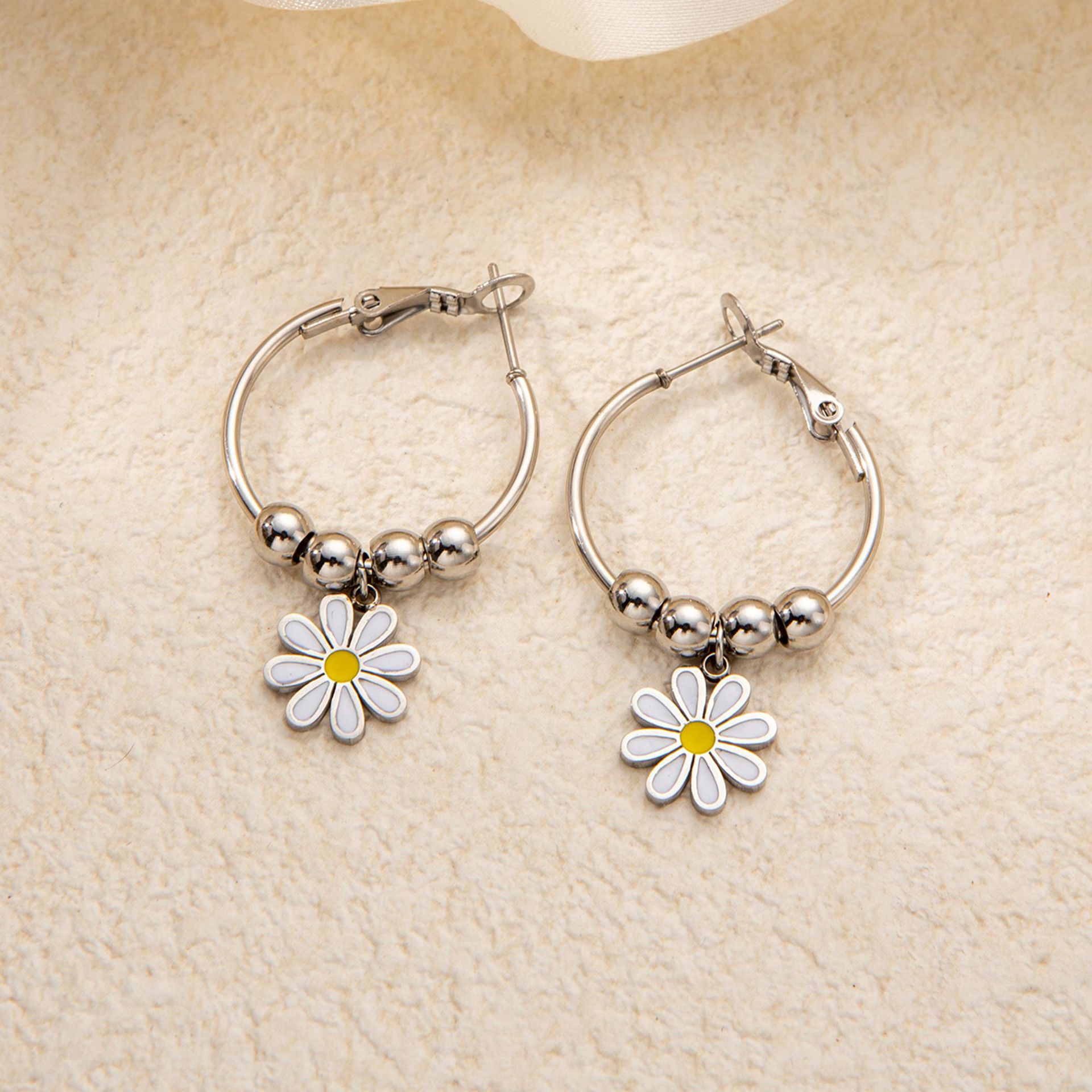 titanium steel round beads flower earrings white gold color