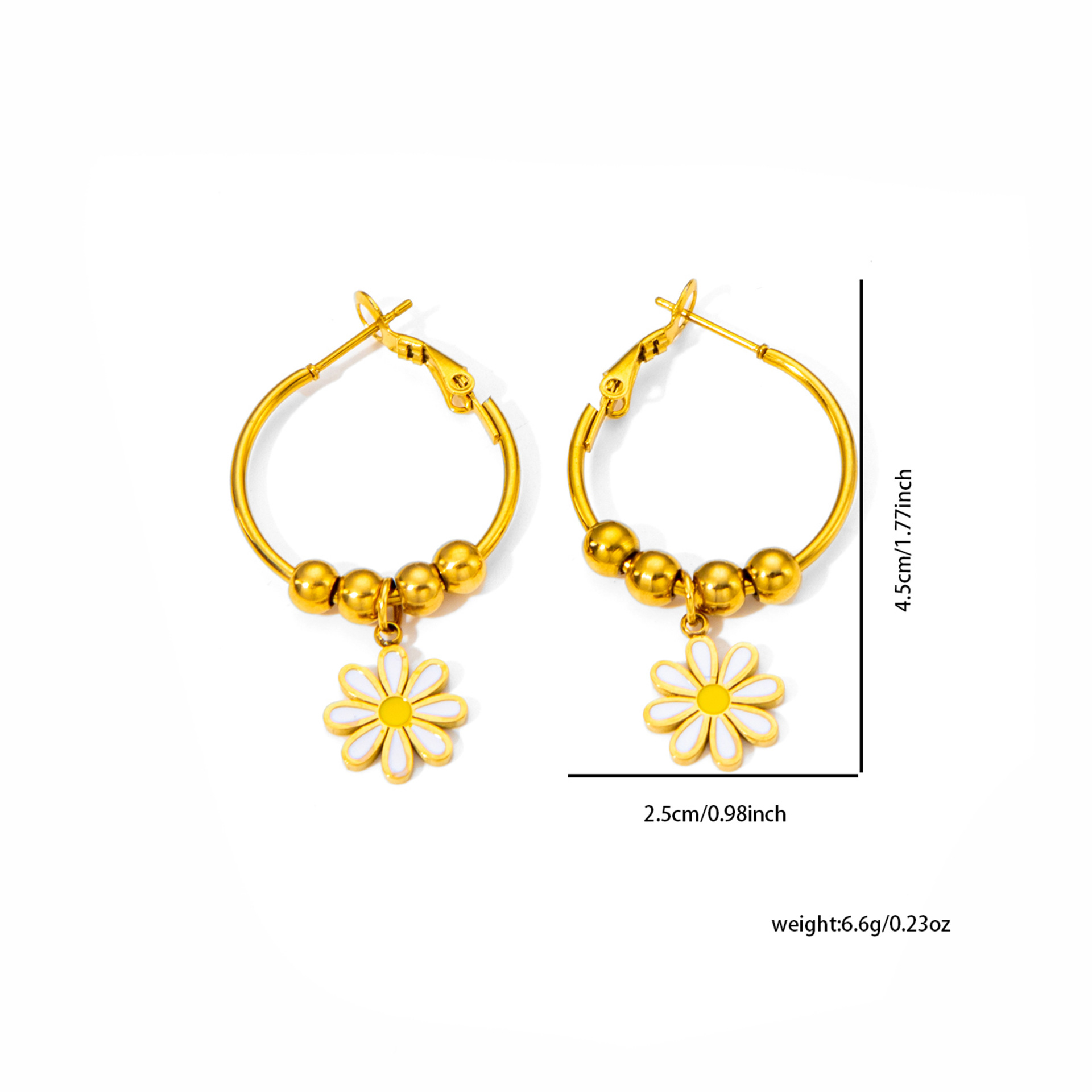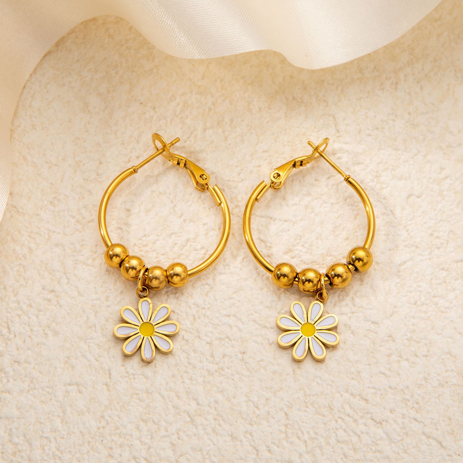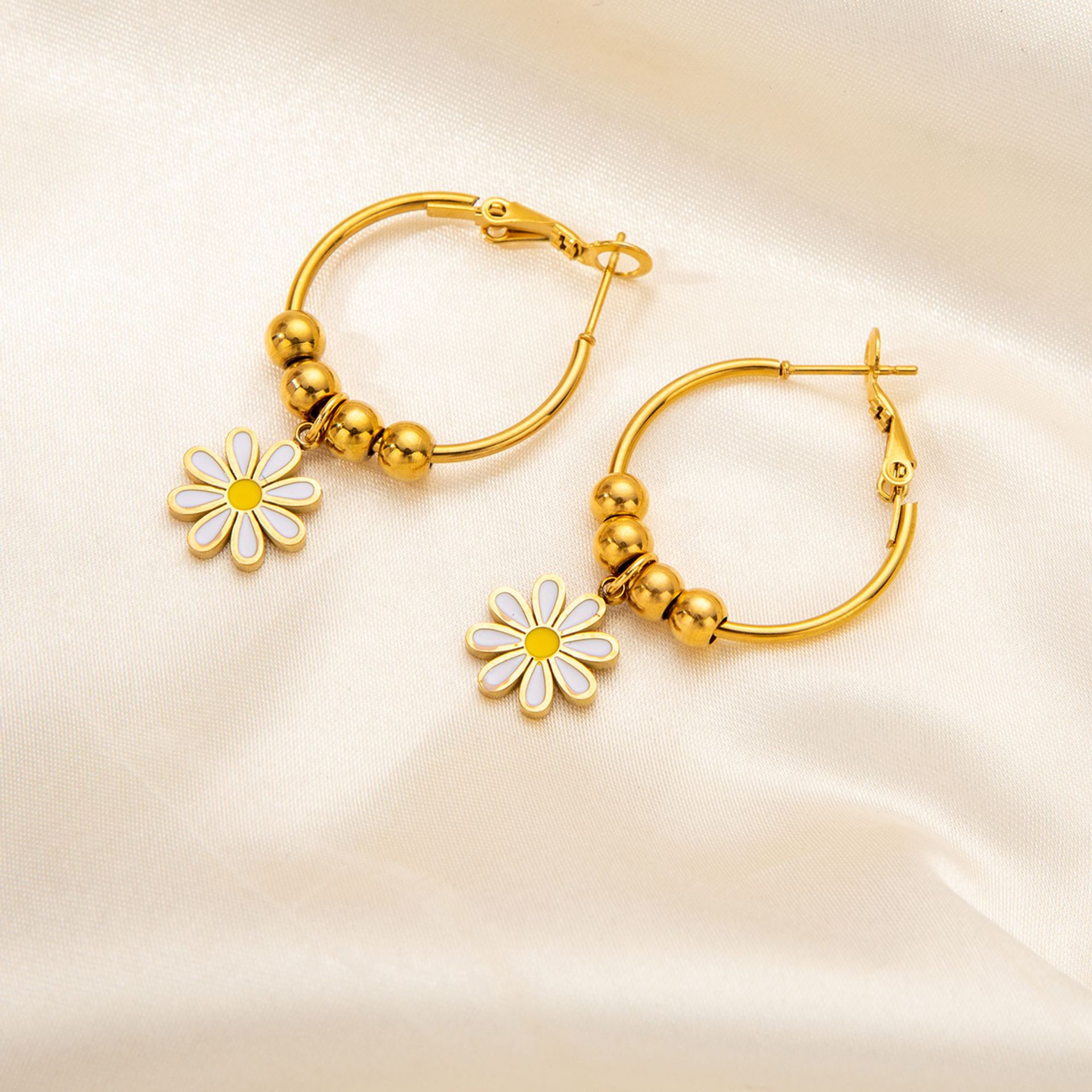 titanium steel round beads flower earrings in gold