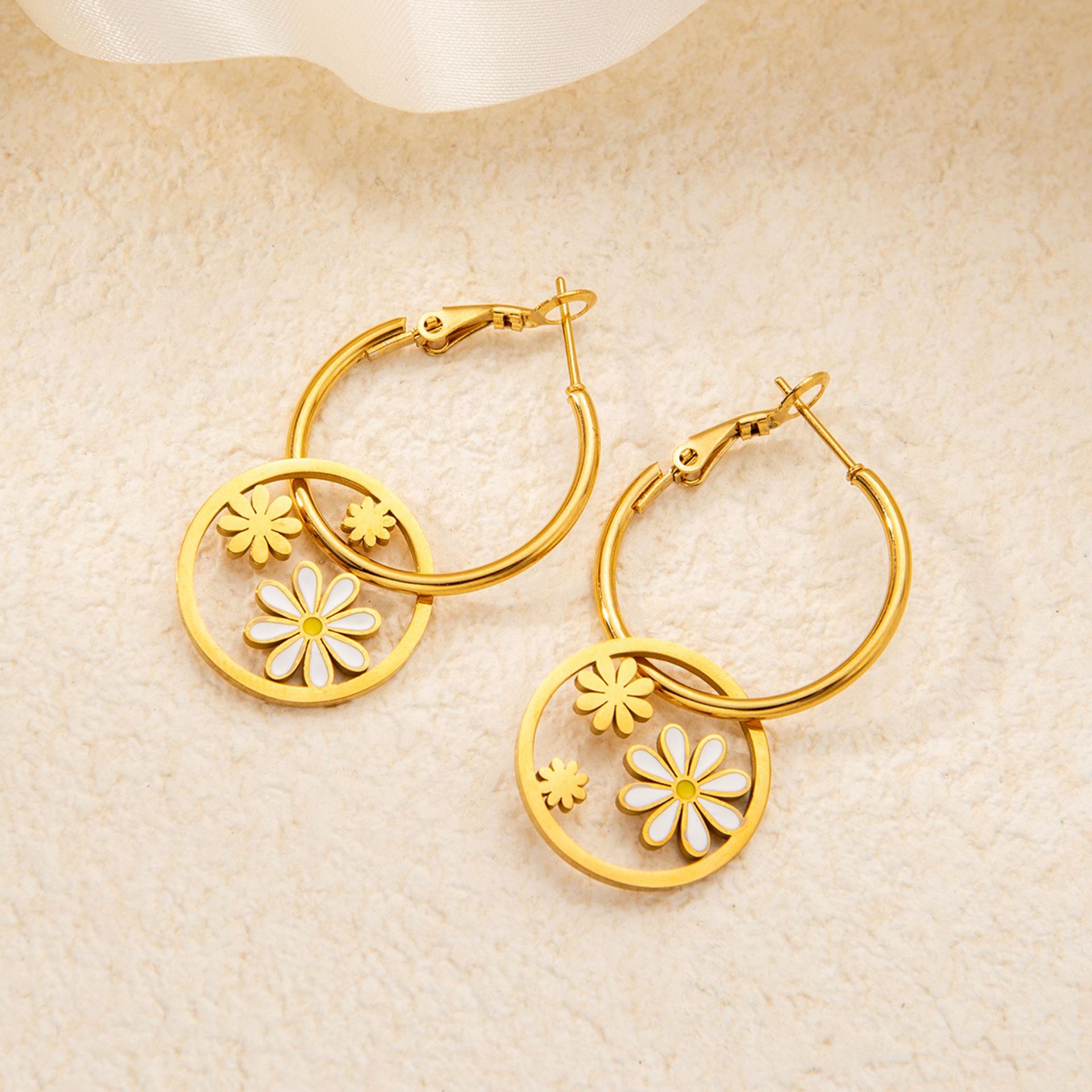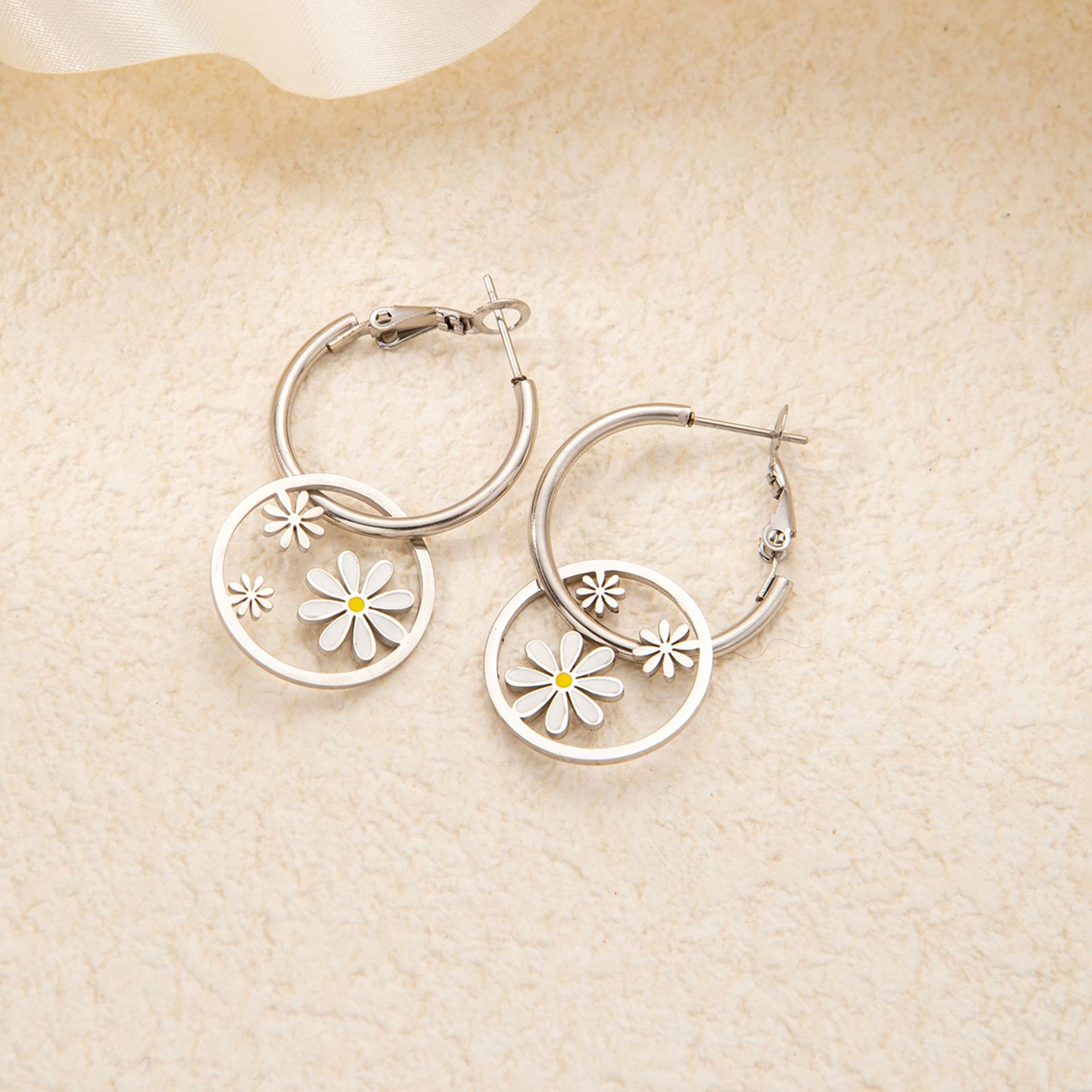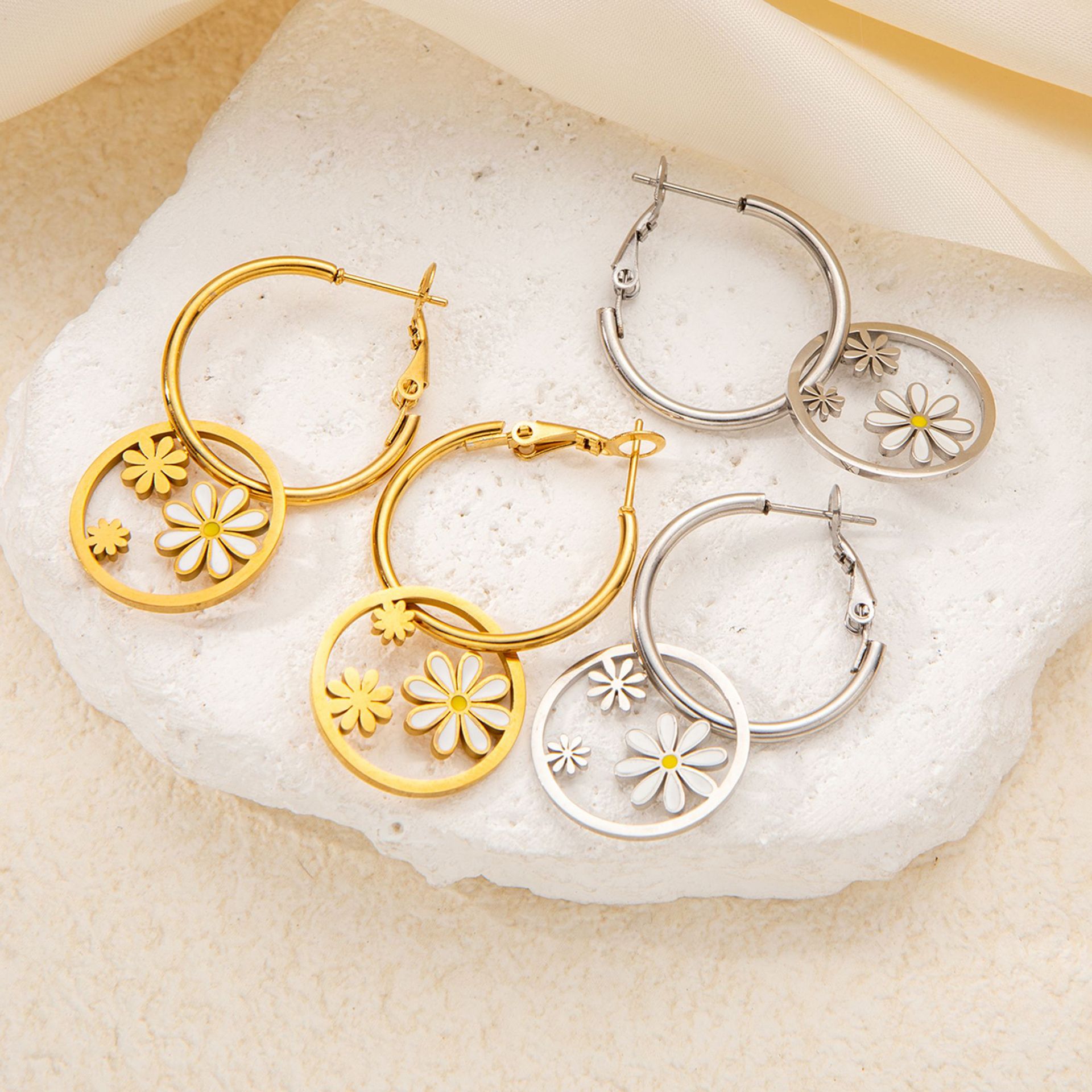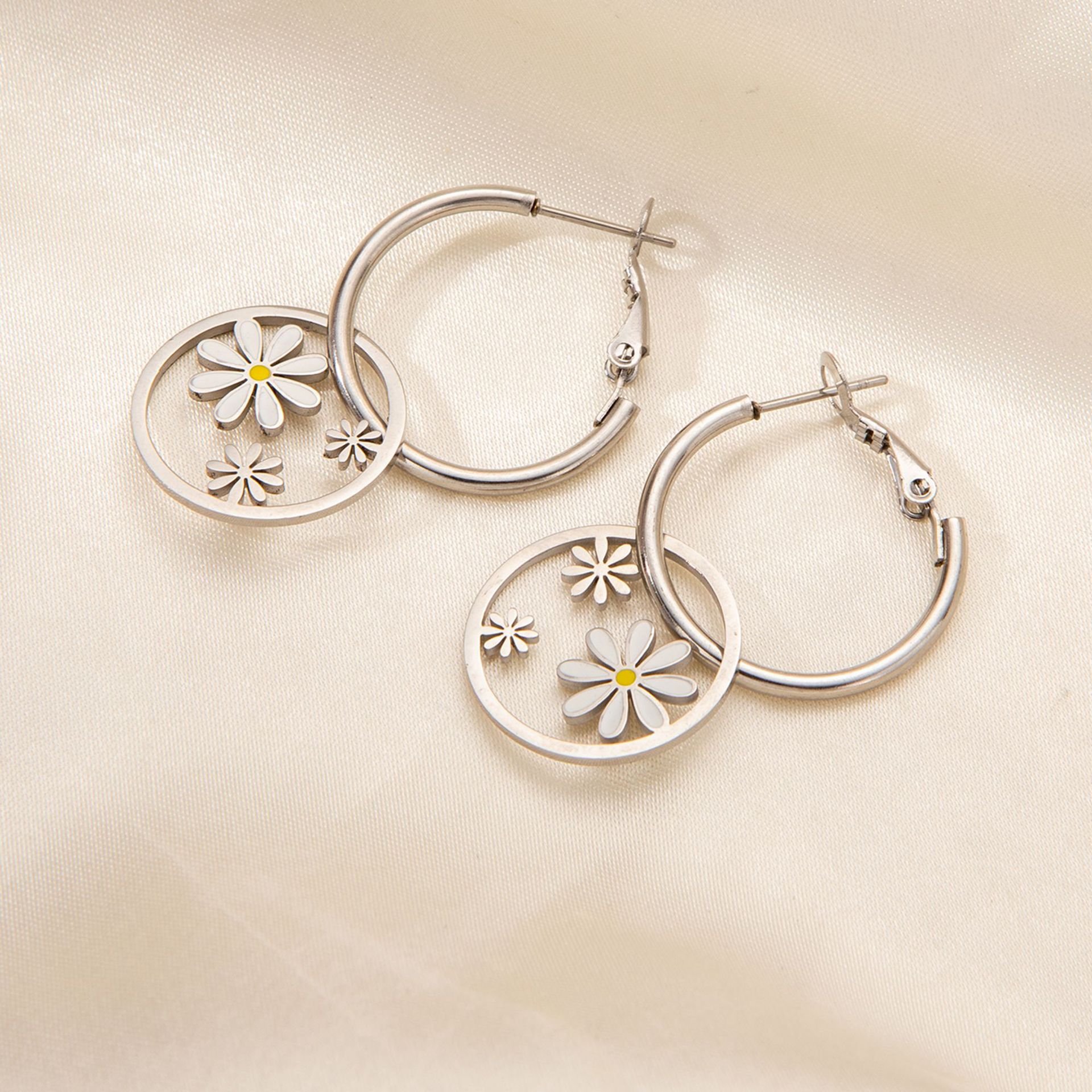 titanium steel large and small flower earrings in white gold color
