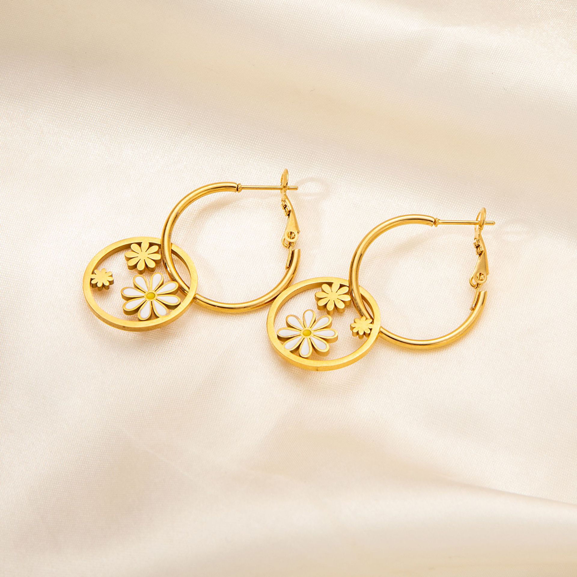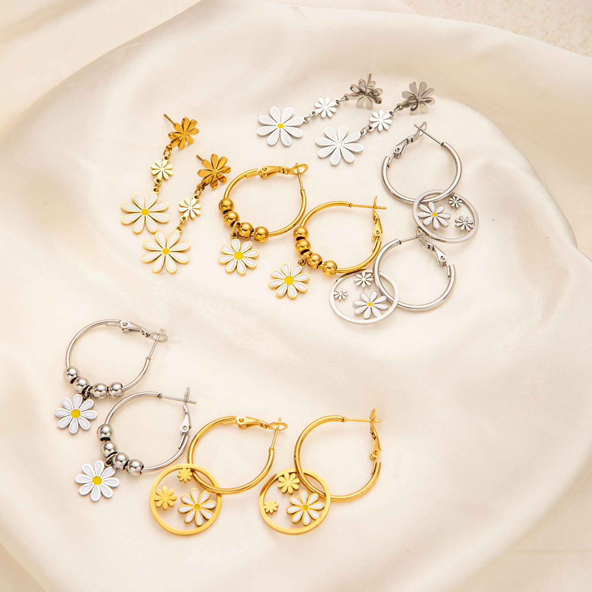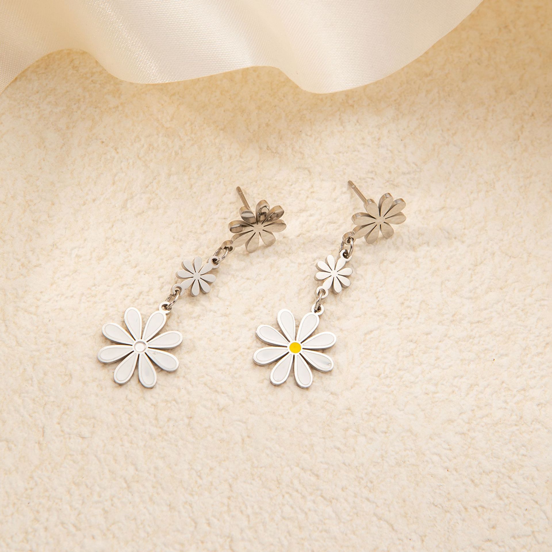 titanium steel large and small flower earrings in white gold color
