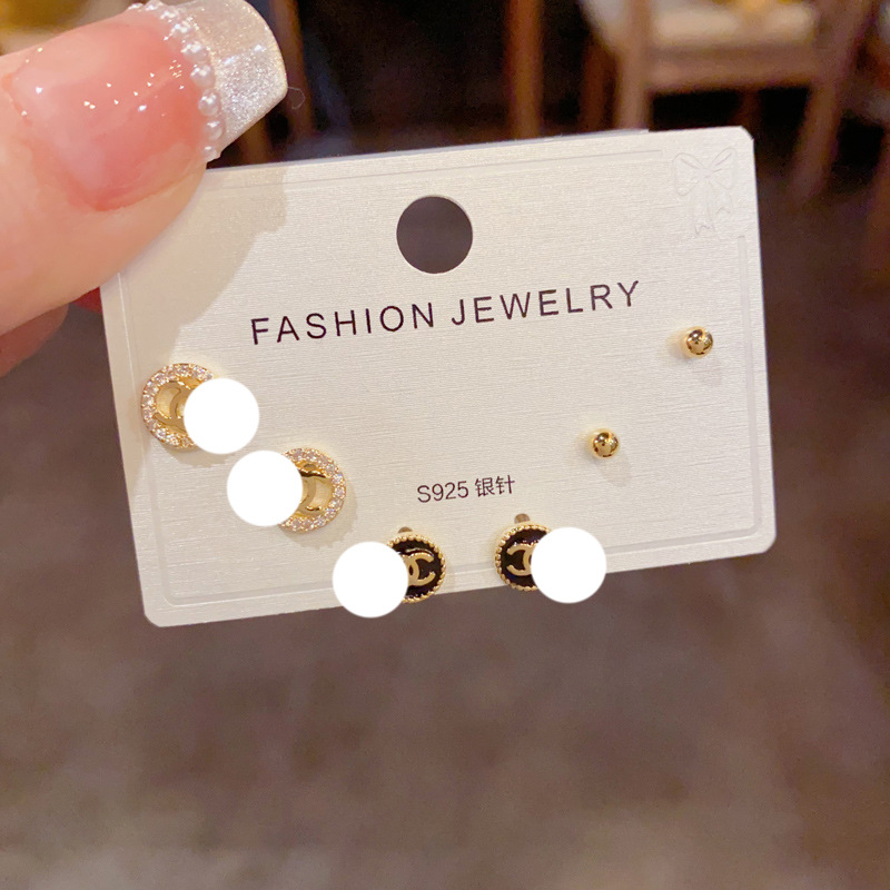 no. 43 silver-zircon round three-piece earrings (thick gold plating)